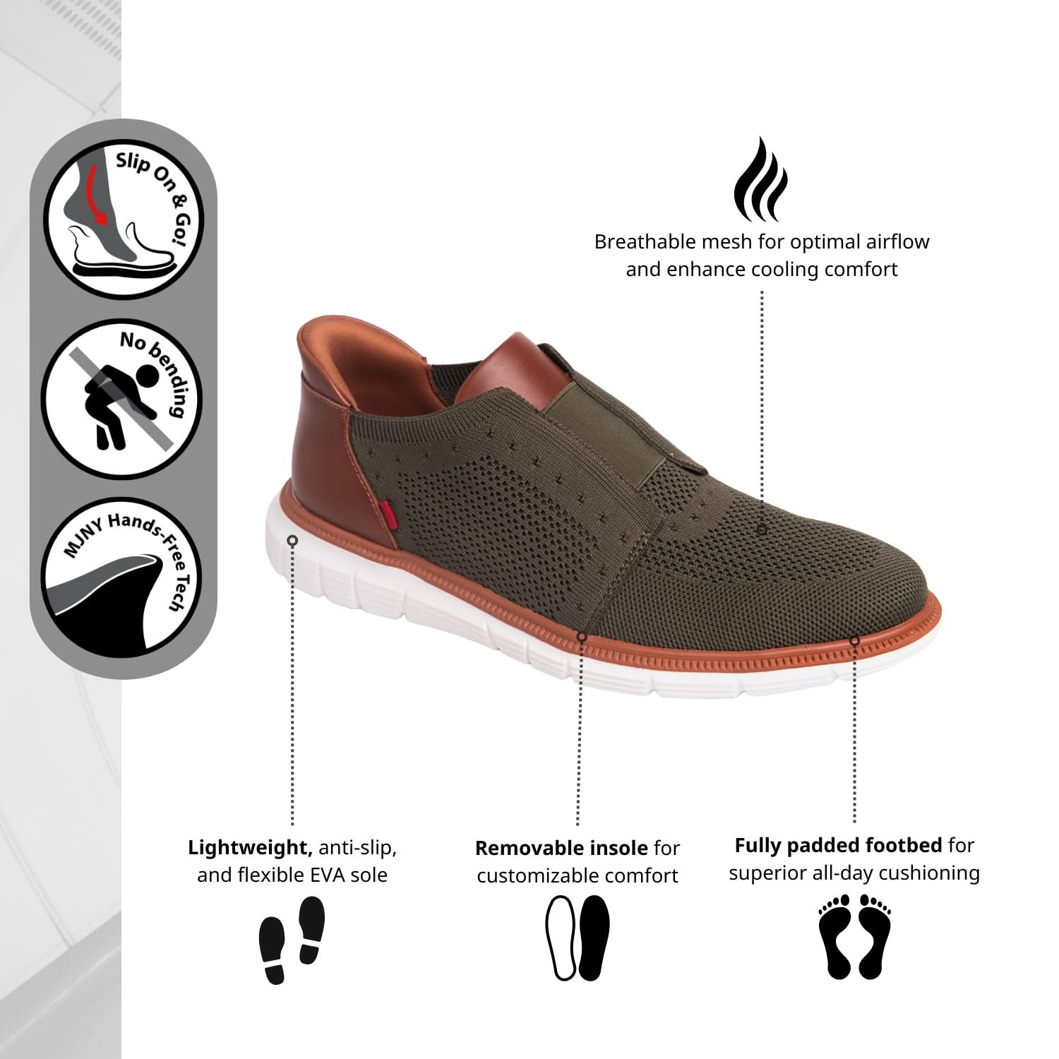 • Hands-Free tech (patent pending): slip-on, no bending, no heel-crush