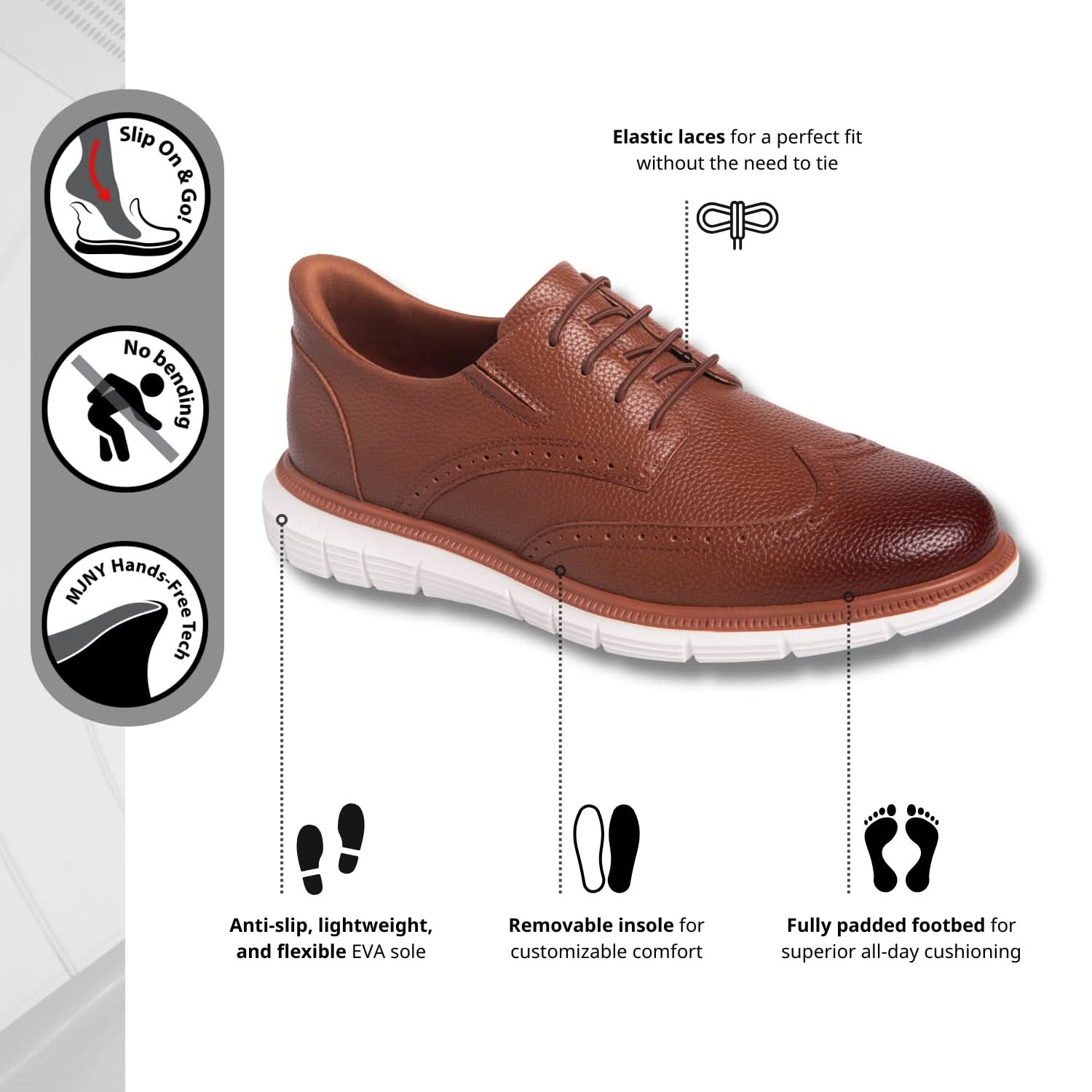 The 'Hill St' brings classic brogue elegance into the modern era with thoughtful innovation and sleek ease. Crafted for men who value sophistication without sacrificing comfort, it features Hands-Free technology and elastic laces that let you slip in effortlessly—no bending, no tugging. A feather-light sole ensures every stride feels easy and agile, while the refined wingtip detailing adds heritage appeal. This is the shoe that carries you from desk to dinner with confidence and unmistakable polish.