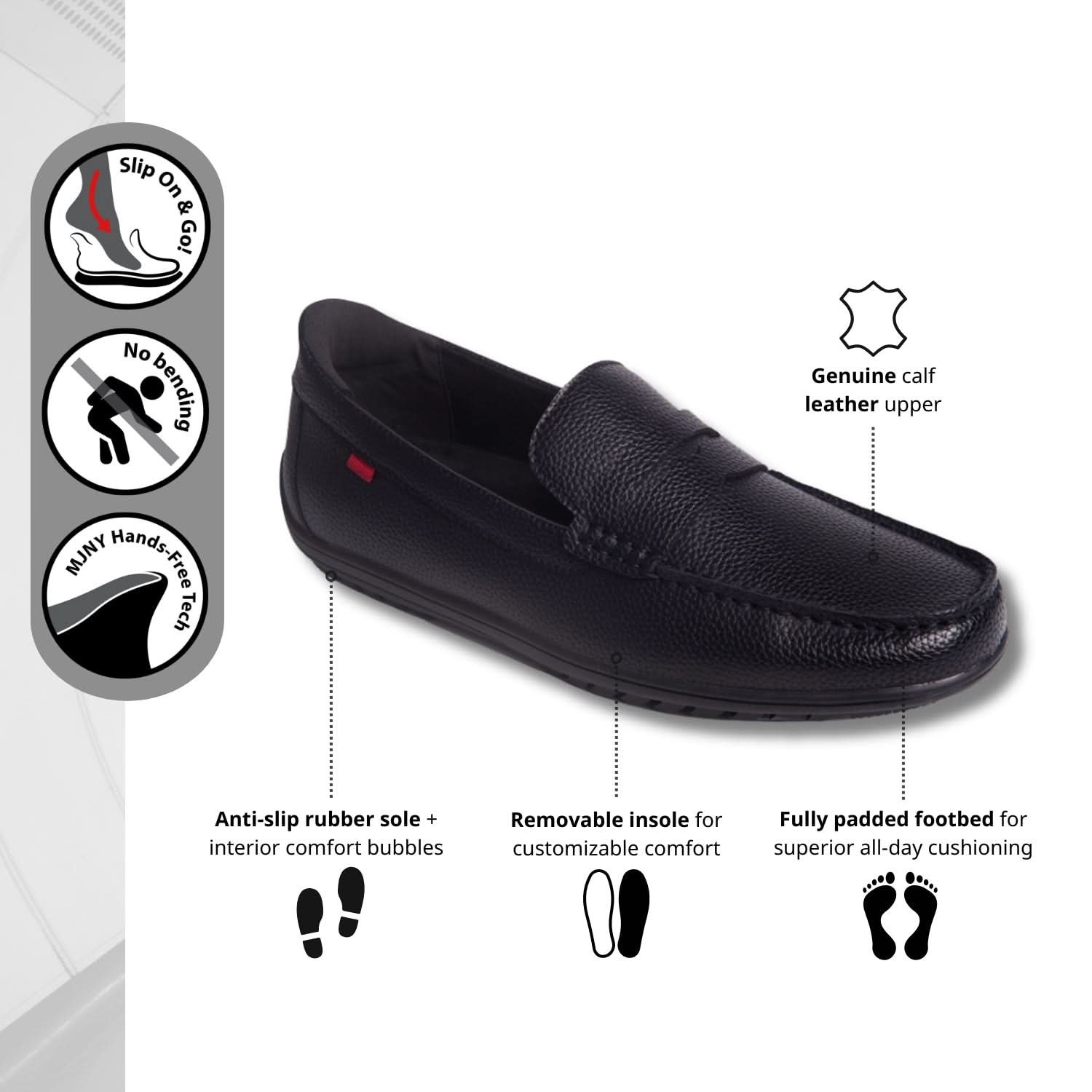 The John St loafer combines timeless elegance with modern convenience. Featuring innovative Hands-Free Technology (Pending Patent), this slip-on design lets you slip on effortlessly—no bending, pulling, or heel crushing. The padded ankle and cushioned footbed deliver superior comfort for all-day wear, while the classic penny loafer design adds a touch of refined sophistication. Perfect for the discerning gentleman, this versatile style transitions seamlessly from casual outings to professional settings. Crafted with premium materials for durability and easy maintenance, the John St loafer is where tradition meets innovation.