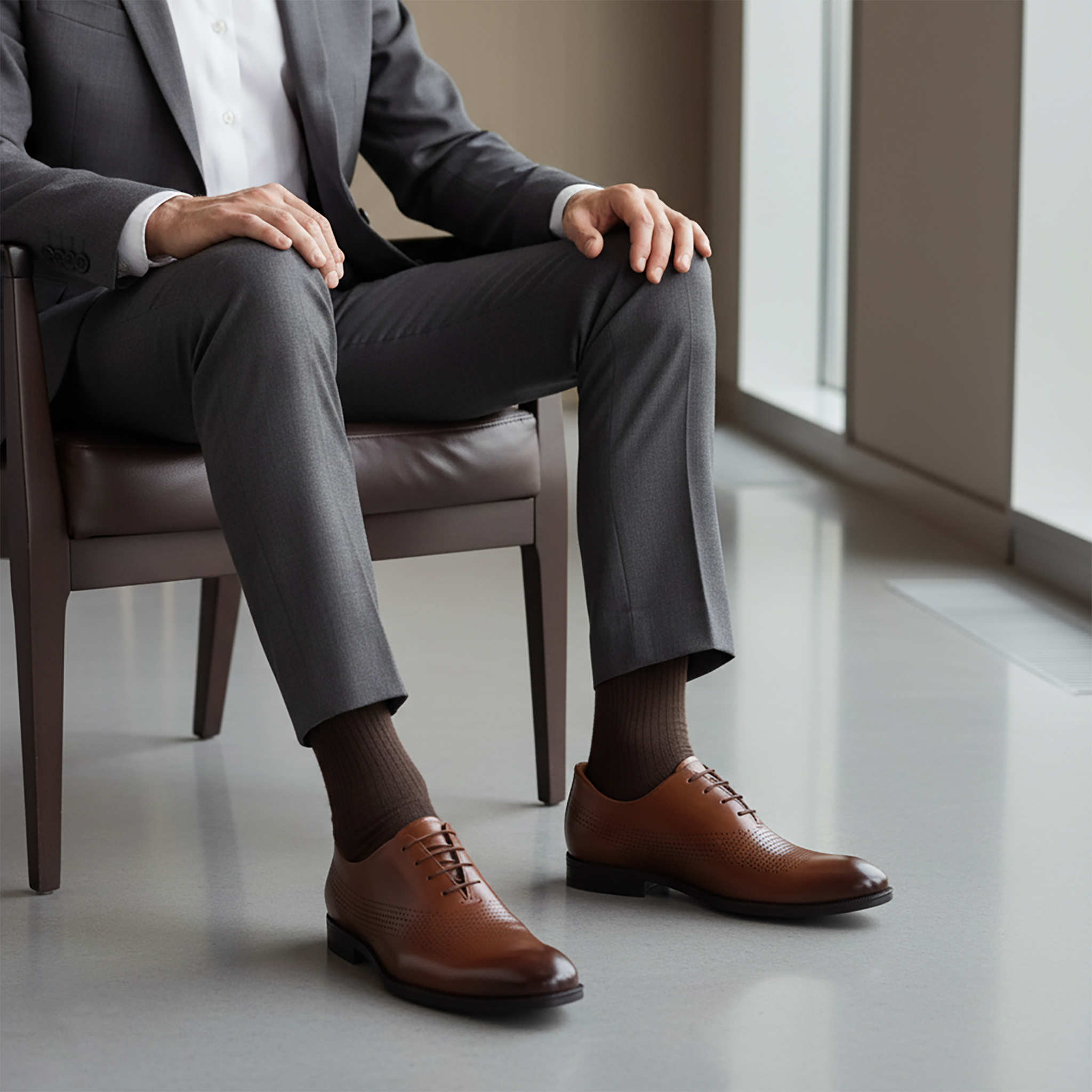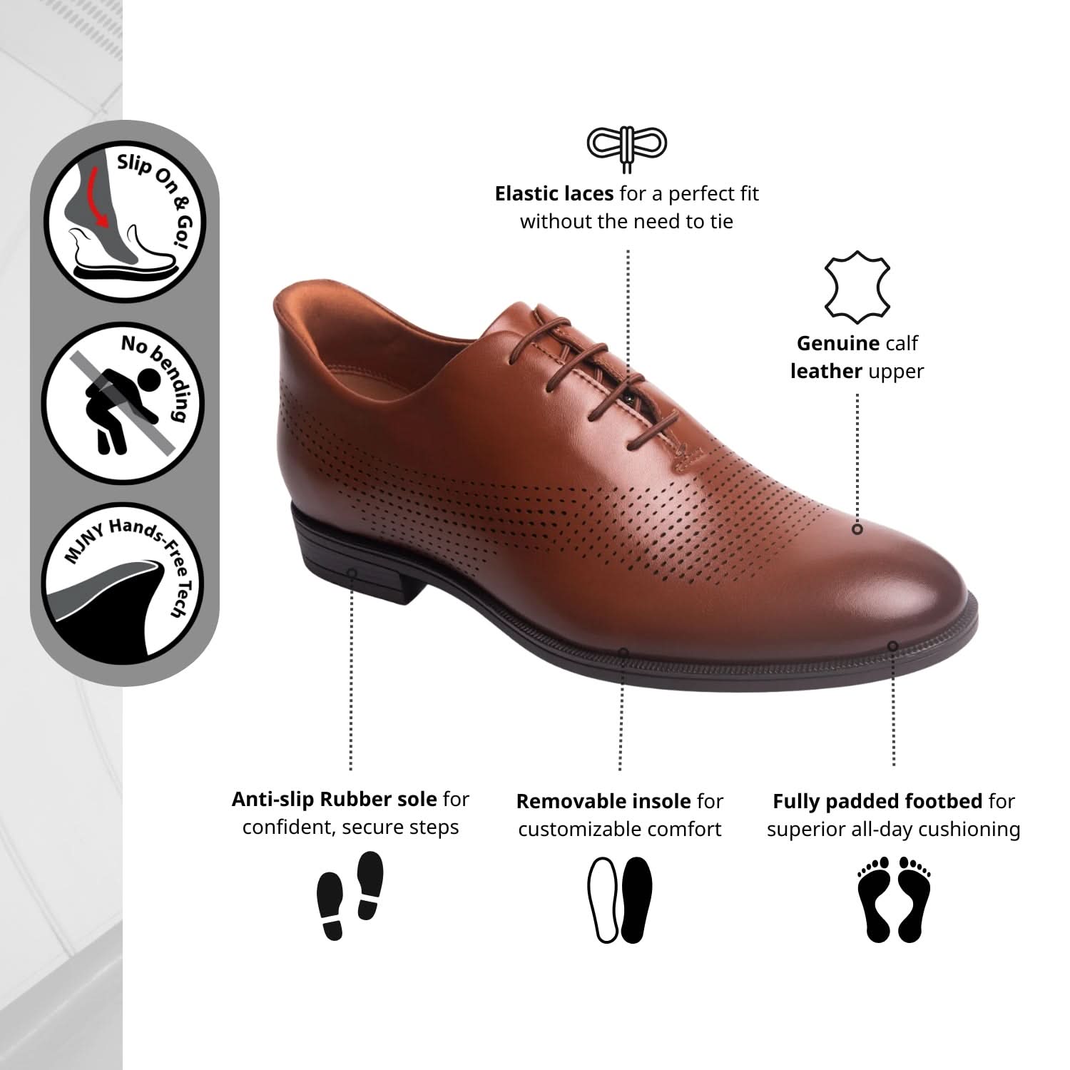 The 'East Rd' is a reimagined oxford for the man who demands precision without the pretense. Its streamlined silhouette is backed by Hands-Free (Patent pending) entry and elastic laces that provide the polish of a classic lace-up with the ease of a slip-on. Perforated detailing adds a refined modern edge, while the genuine calf leather upper deliver breathable luxury. Elegant, efficient, and quietly bold—this is formalwear without friction.