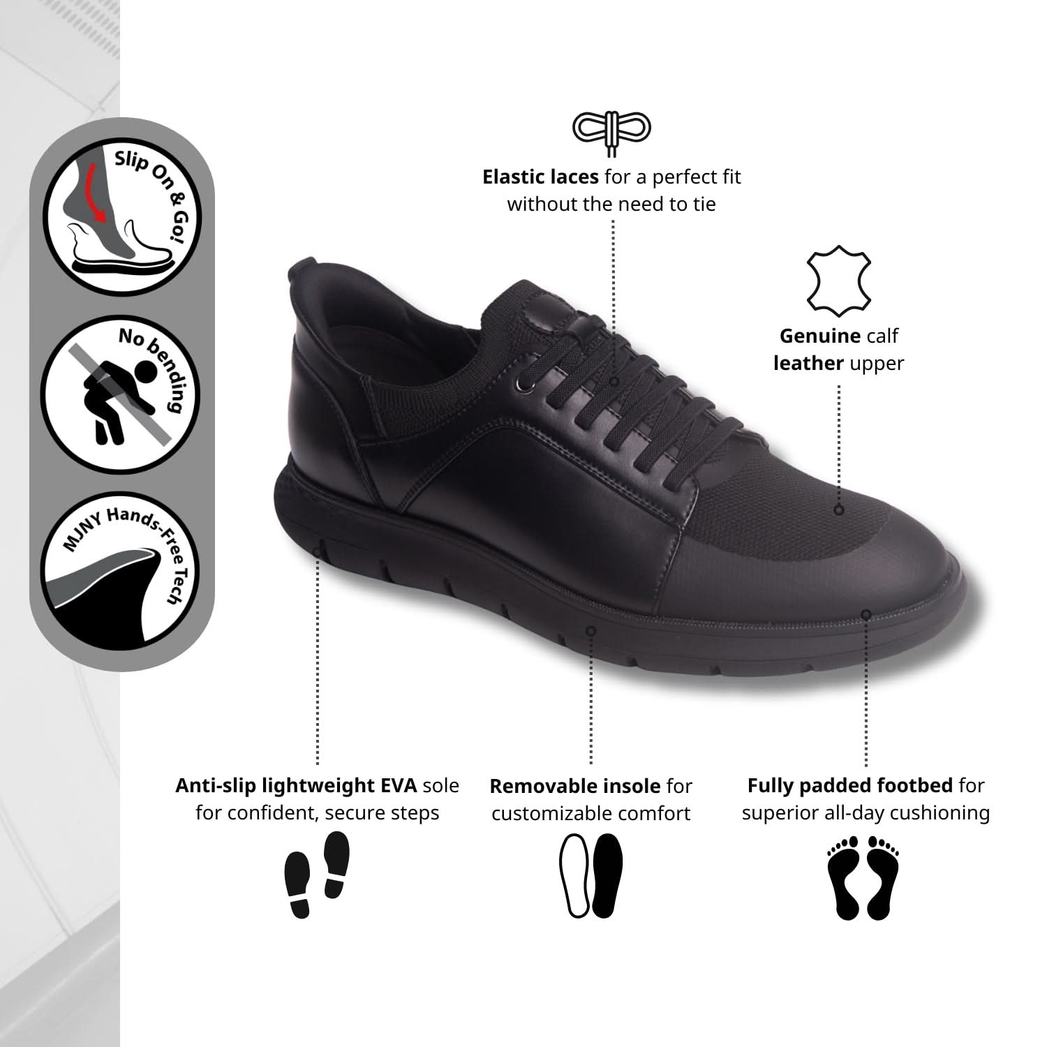 The 'Newbury St' is crafted for the man who demands ease without sacrificing elegance. Its Hands-Free (Patent pending) design lets you step in and out with zero effort—no bending, no fuss. The featherweight sole cushions every stride while reducing fatigue, and elastic laces offer a tailored fit that flexes with your movement. Wrapped in genuine calf leather, this sneaker delivers comfort and polish in equal measure—an everyday essential designed to move as effortlessly as you do.