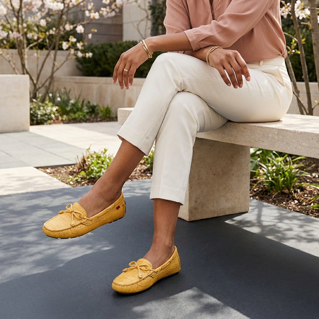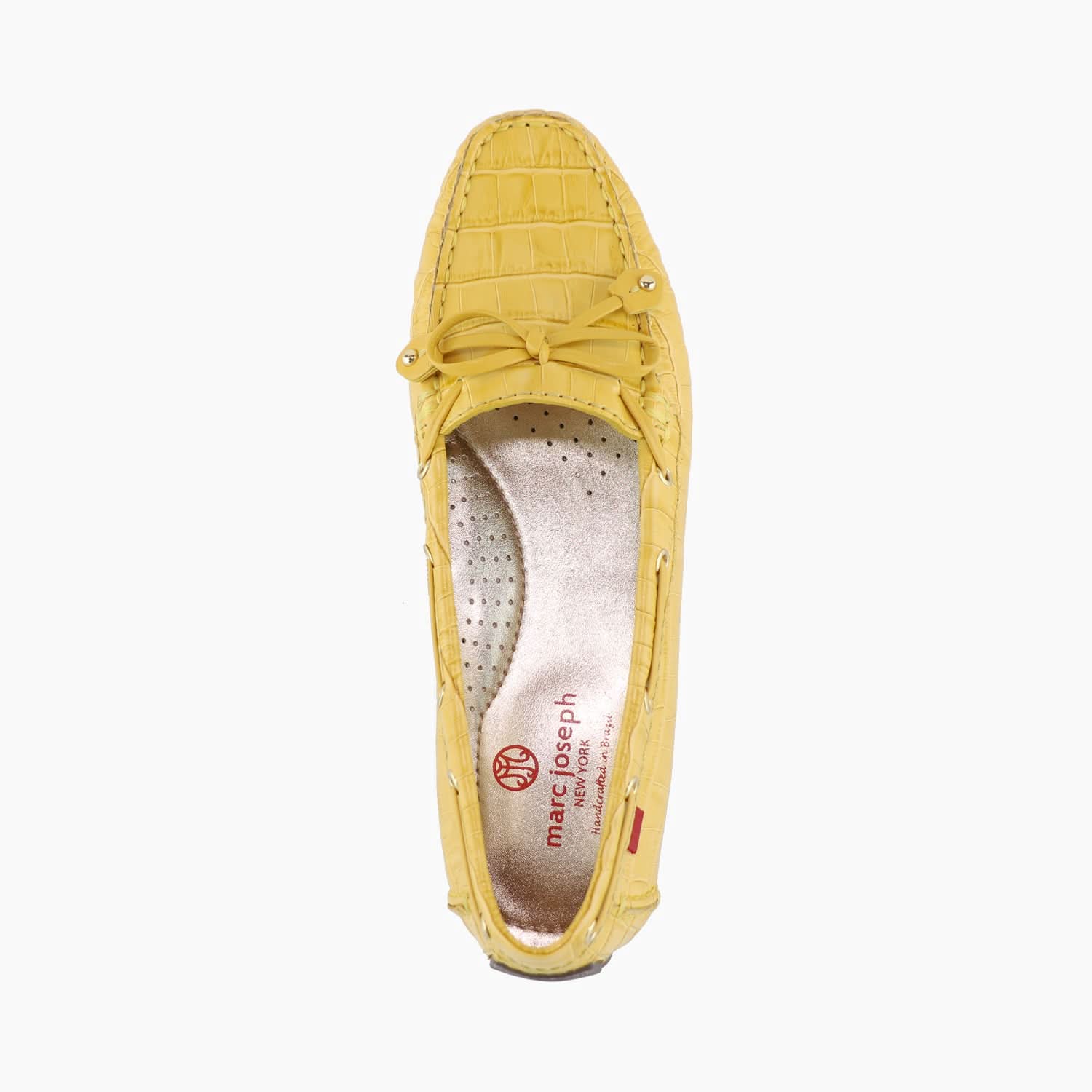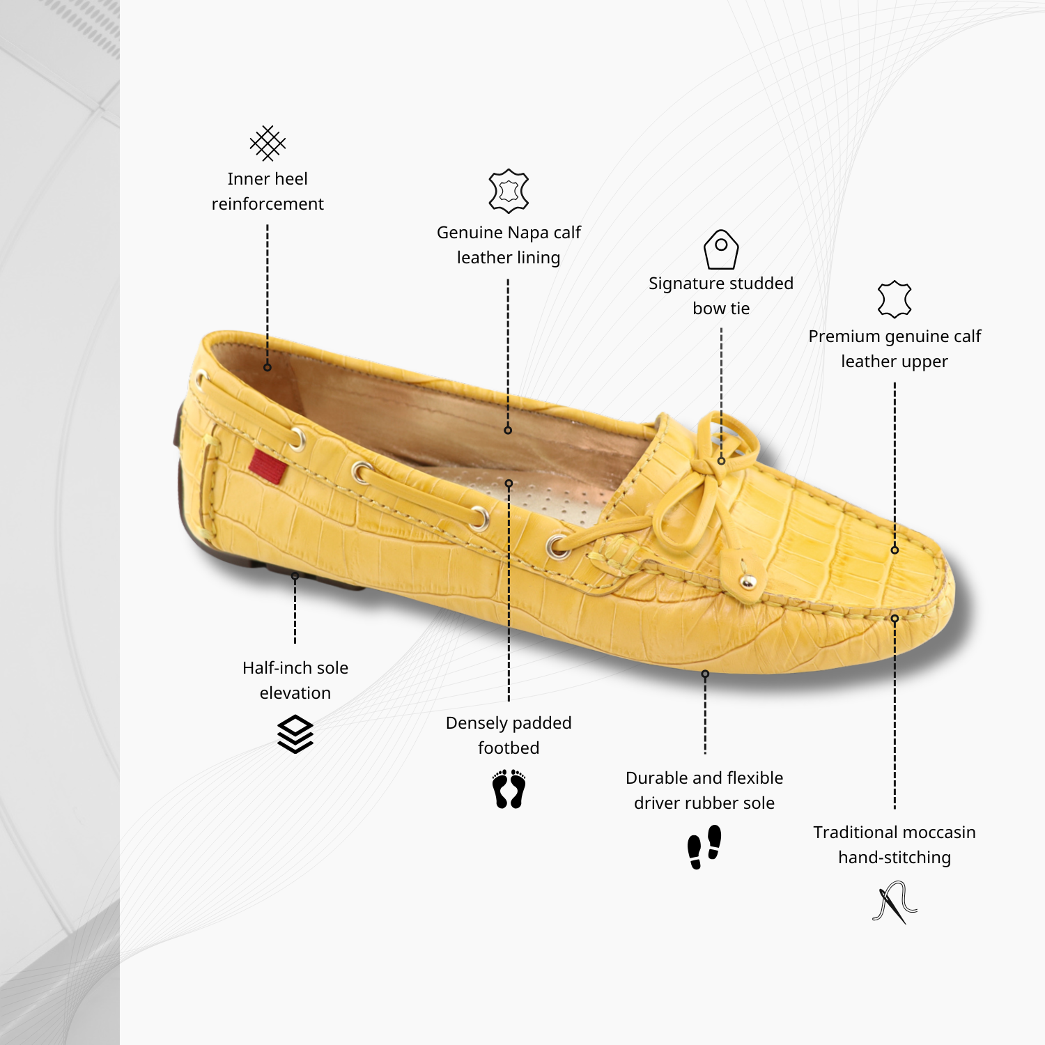 The 'Cypress Hill' driver is a vibrant expression of casual luxury, designed for women who appreciate distinctive style and exceptional craftsmanship. Handcrafted in Brazil, it features a richly textured Sunflower Croco genuine calf leather upper paired with a supple genuine Napa calf leather lining for remarkable softness and breathability. The signature bow detail adds a refined touch, while traditional moccasin hand-stitching highlights its artisanal character. A densely padded footbed and flexible driver rubber sole deliver superior comfort and durability. Bold yet sophisticated, it brings effortless personality and polished ease to everyday dressing.