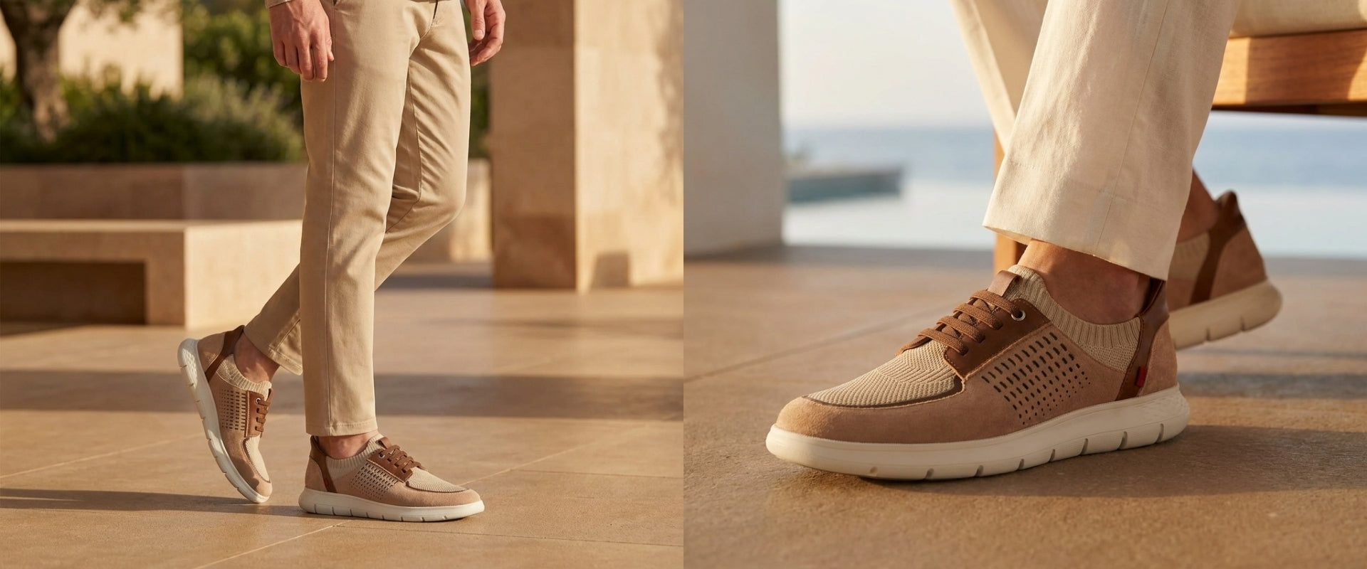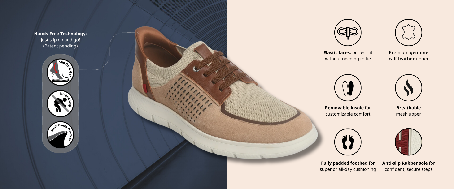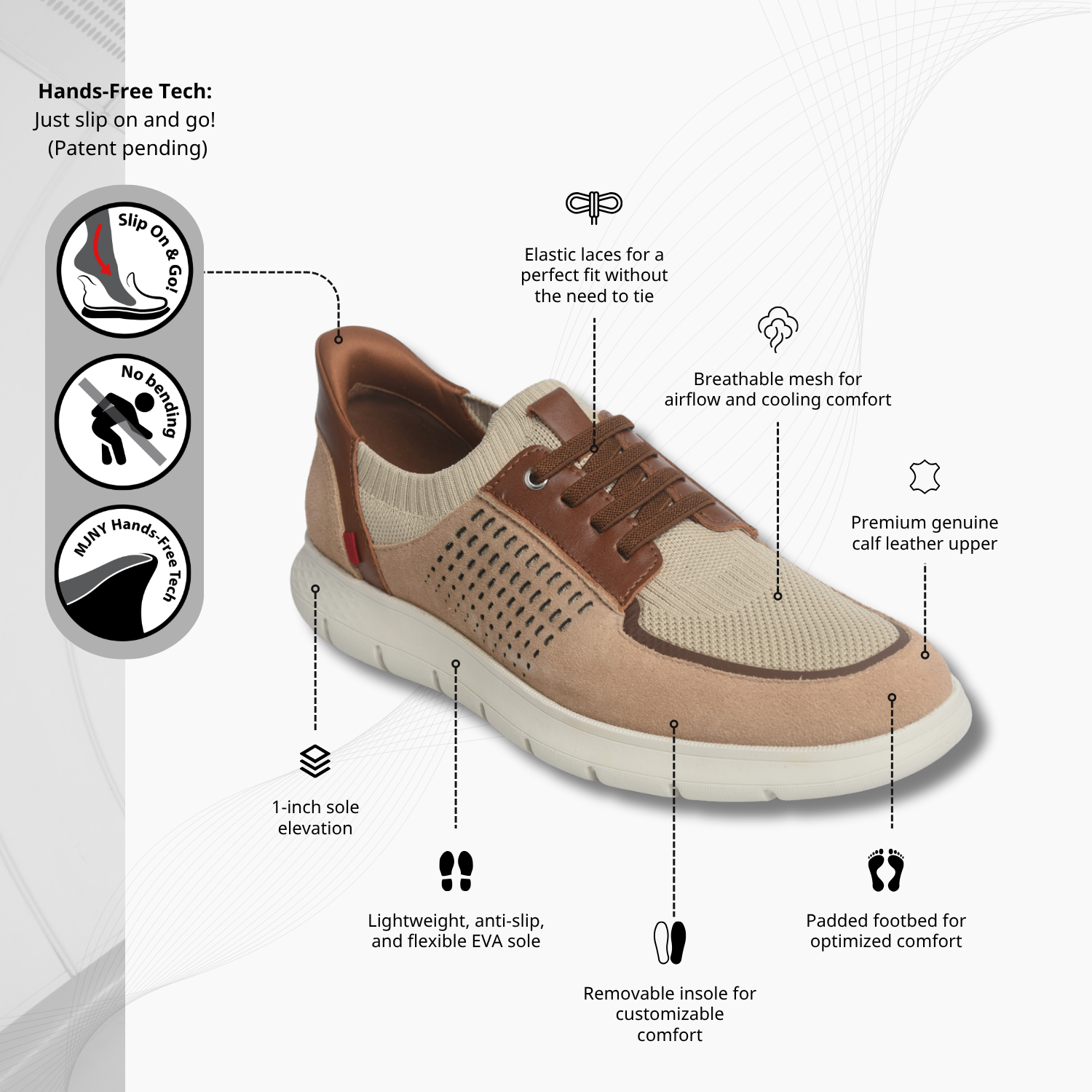 The 'Buffalo St' sneaker in beige presents a sophisticated fusion of modern comfort and relaxed elegance. Crafted with a refined combination of soft suede, breathable mesh textile, and smooth leather accents, it delivers rich texture and visual depth in a versatile neutral tone. The upper and lining are made from genuine calf leather, ensuring a supple feel, durability, and a premium interior finish. Featuring hands-free technology and elastic laces, it allows effortless slip-on convenience with a secure fit. A lightweight flexible outsole and cushioned footbed complete this design, offering exceptional all-day comfort with contemporary luxury appeal.