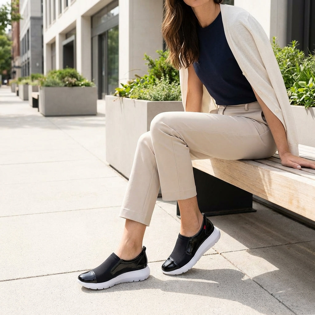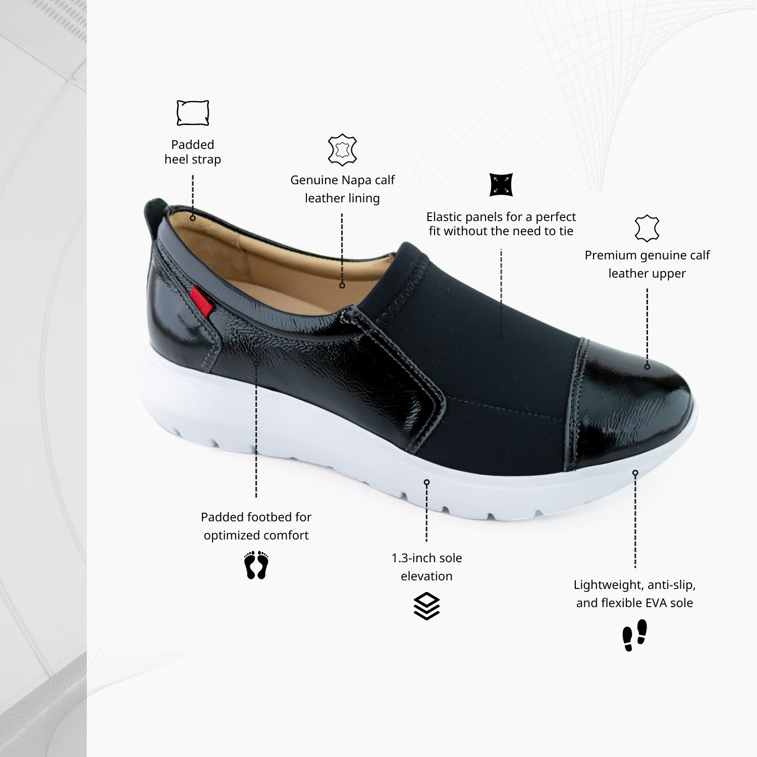 The 'Jay St 2.0' sneaker reflects a modern approach to everyday luxury, balancing athletic ease with refined craftsmanship. Designed in New York and crafted in Brazil, it features a glossy patent genuine calf leather upper paired with a supple Napa genuine calf leather lining for a soft, breathable feel. The stretch vamp allows a flexible, personalized fit, while the padded collar and cushioned, removable footbed provide exceptional all-day comfort, even with custom orthotics. Finished with a lightweight, shock-absorbing sole and subtle signature details, it delivers effortless sophistication with practical versatility.