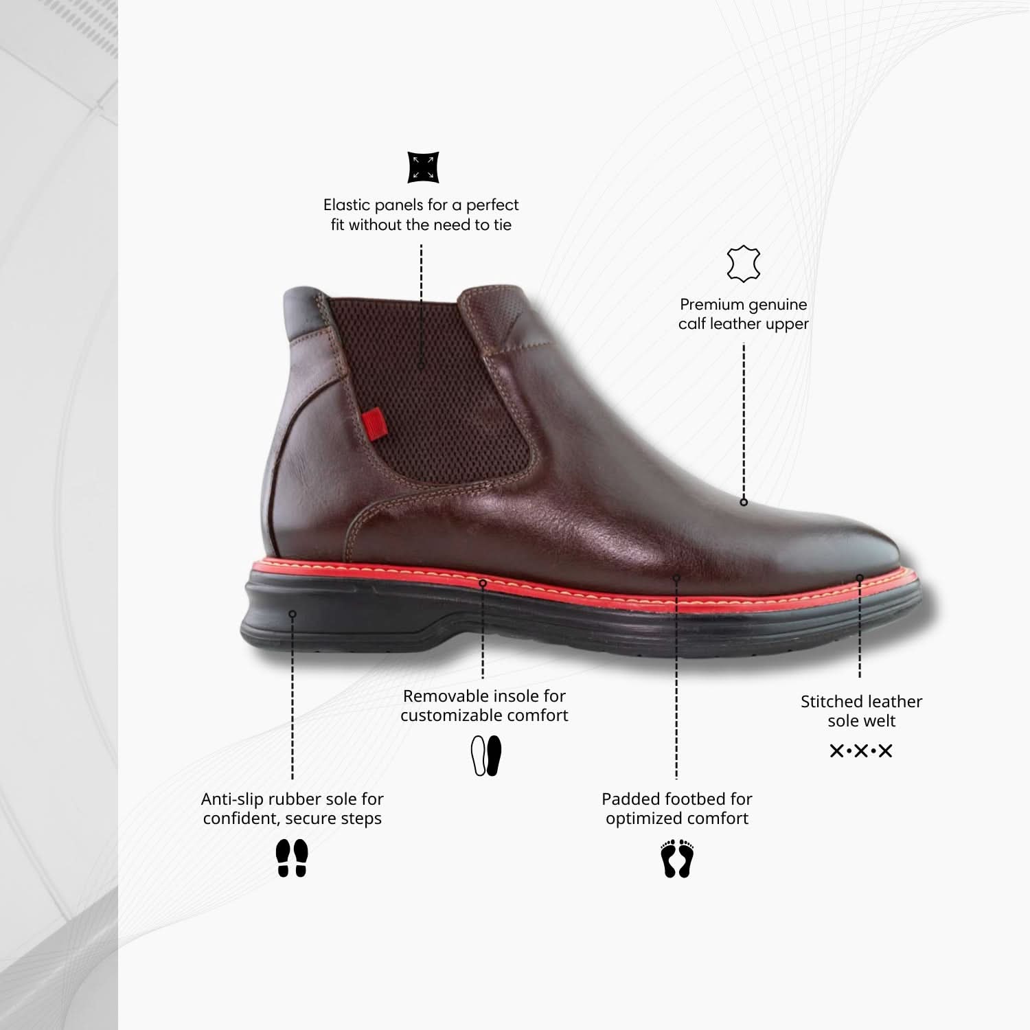 • Elastic side panels for easy slip-on convenience and a flexible fit