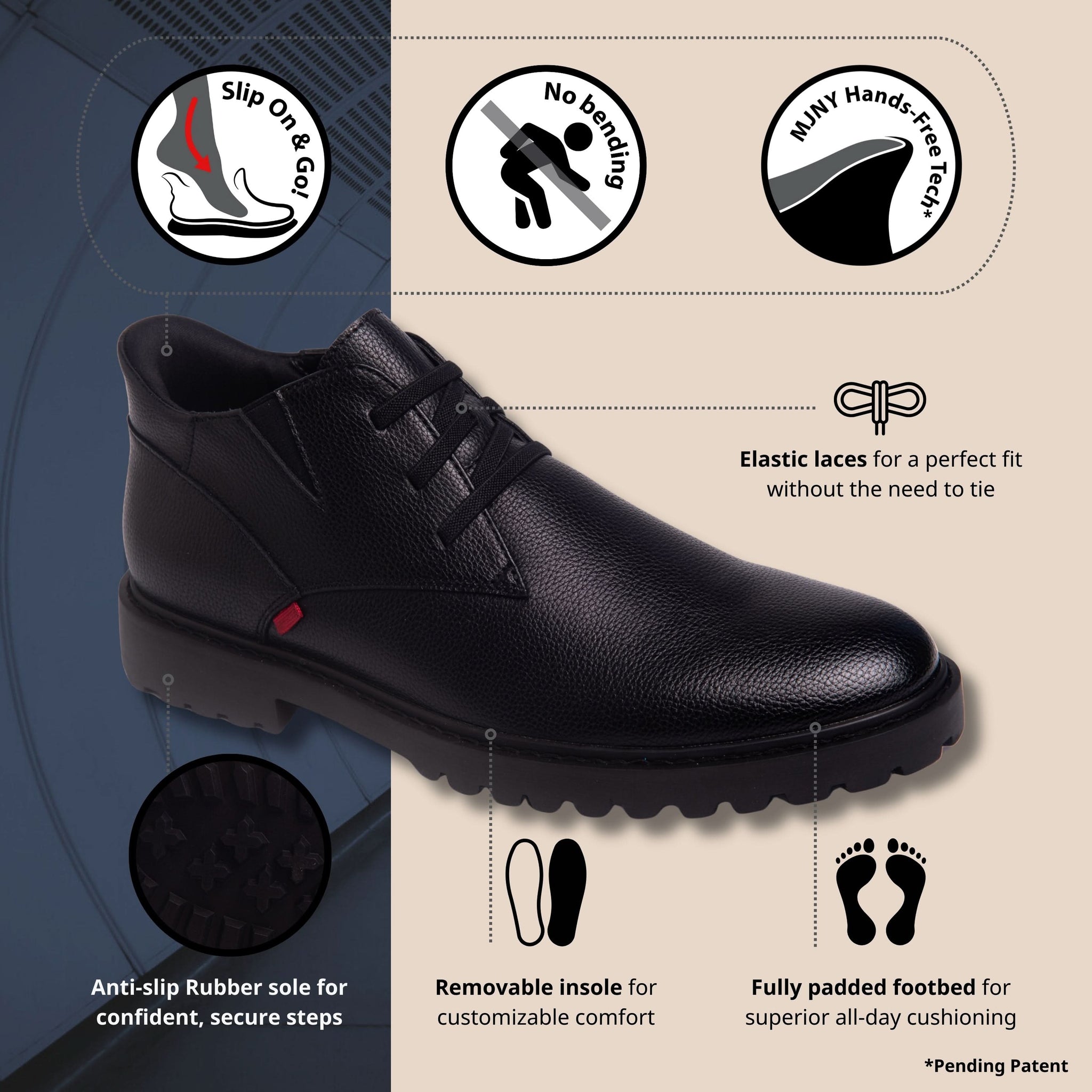 The 'Clark Rd' is where timeless sophistication meets modern innovation. Designed with the first-ever hands-free boot technology, it redefines everyday ease. Just slip on and go, no bending or tying required. Elastic laces offer a refined fit without compromising elegance, while the premium genuine calf leather upper ensure lasting luxury. Underfoot, a fully padded footbed and removable insole provide cloud-like comfort, and an anti-slip rubber sole keeps every step secure. Crafted for the discerning gentleman who values style without sacrificing convenience.