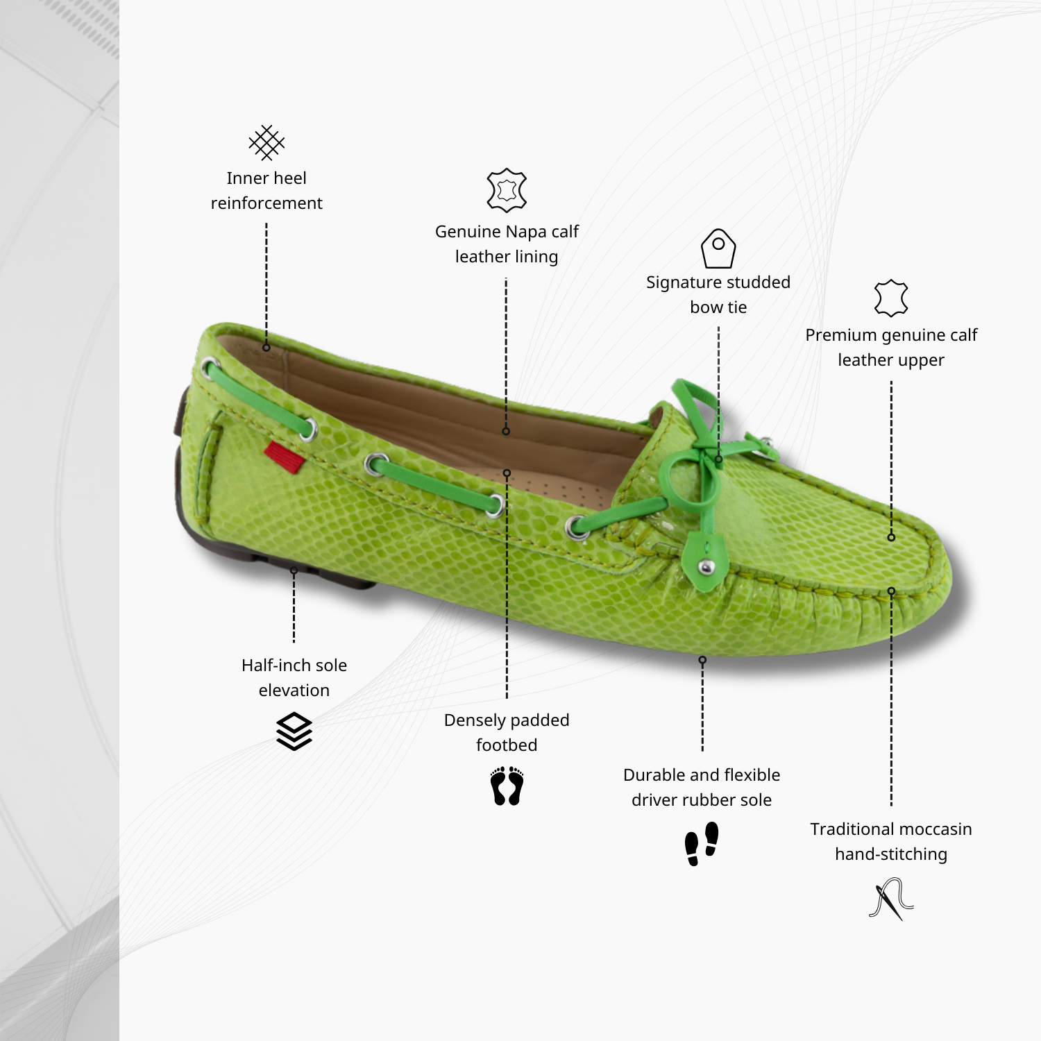 Designed in NYC and handcrafted in Brazil from genuine calf napa leather, inside and out. Traditional moccasin hand-stitching shapes a soft, glove-like fit. A gel heel insert and fully padded footbed absorb impact. The durable, flexible rubber driver sole with a ½-inch lift delivers quiet traction. Finished with a signature studded bow-tie, discreet tag, and emblazoned driver plug.