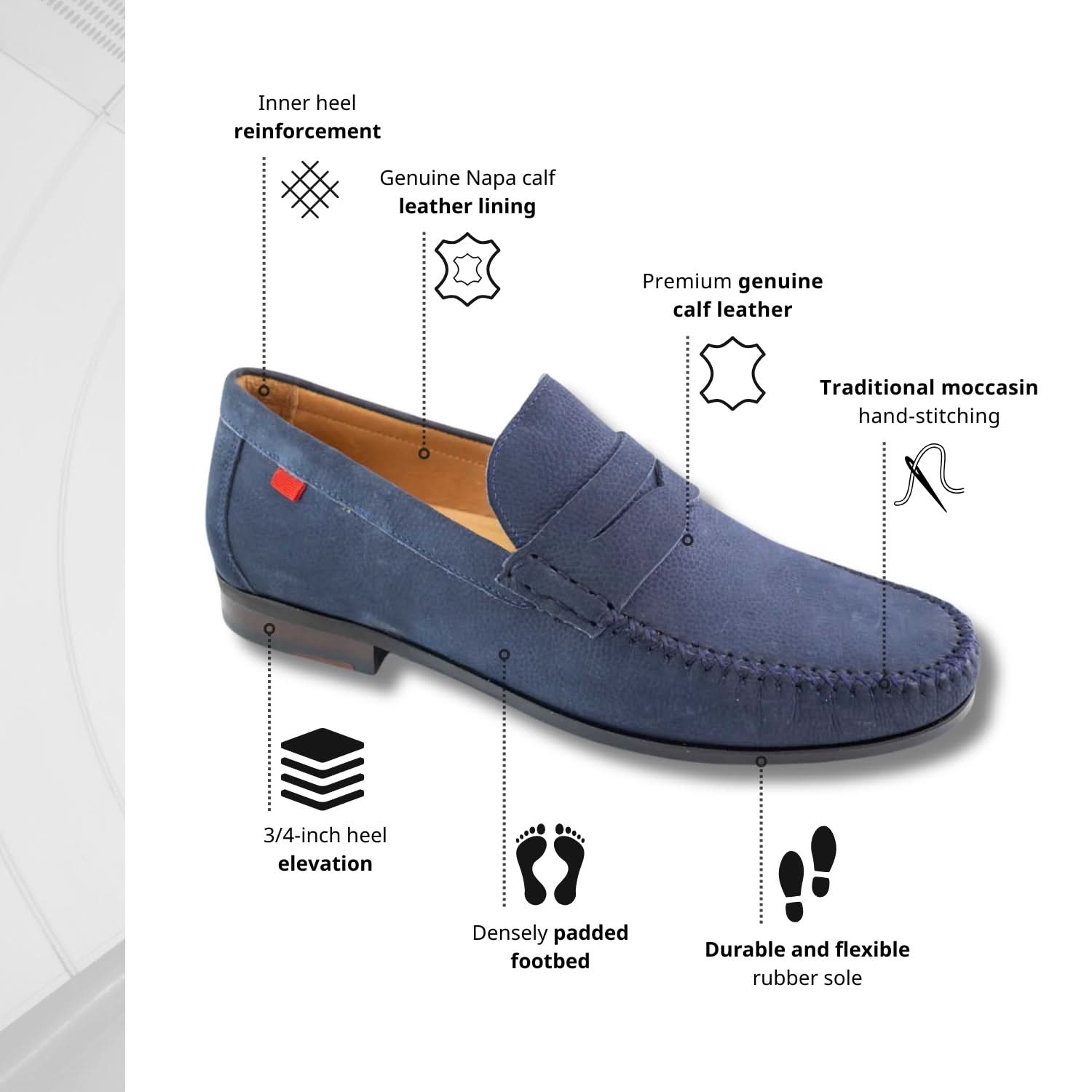 Experience luxurious comfort with Marc Joseph. Immerse yourself in our world of unrivaled craftsmanship, where each product is meticulously created with unwavering attention to detail. Enjoy the flexibility of our rubber sole, the timeless artistry of hand stitching, the luxurious softness and durability of genuine calf leather, and the ultimate comfort of our cushioned footbed.