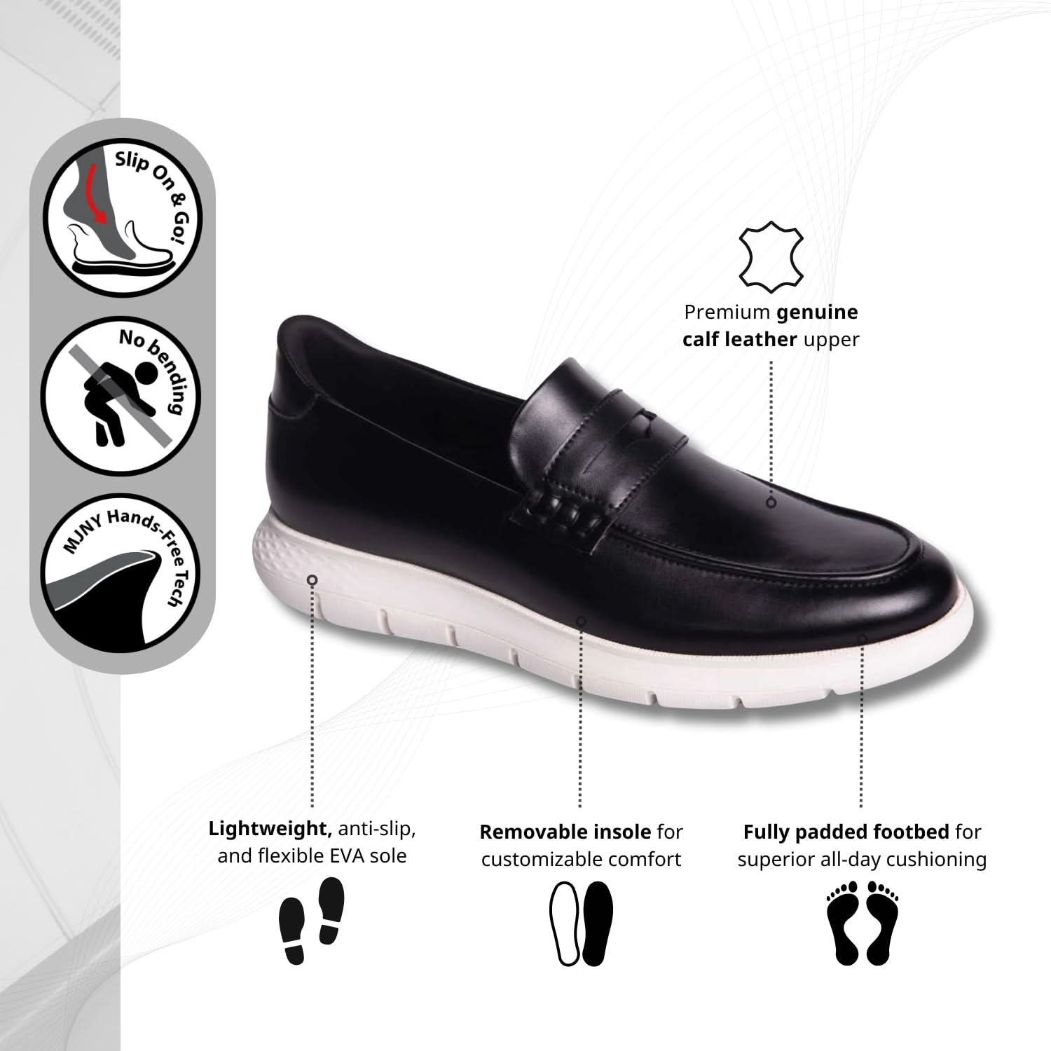 The Douglas St casual penny loafer redefines modern convenience and style with its revolutionary Hands-free Technology (Pending Patent) —offering a seamless, just Slip On experience. Featuring a lightweight, anti-slip EVA sole, this loafer is engineered for supreme flexibility and all-day comfort. Designed to adapt to your every step, it delivers a weightless feel that keeps you moving effortlessly. Perfectly balancing contemporary design with practicality, the sleek profile elevates your look while ensuring durability and ease. Ideal for the modern man who values both sophistication and everyday functionality.