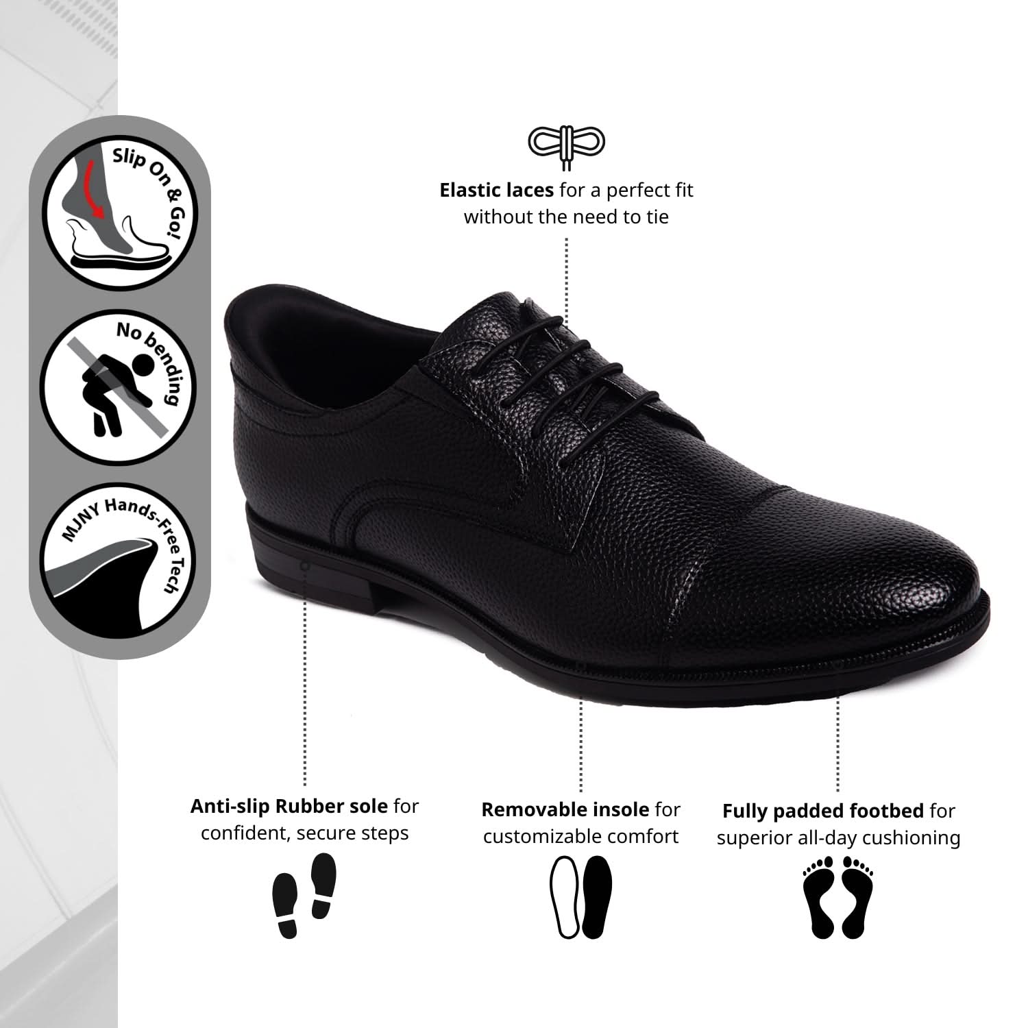The 'Baker St' is a masterclass in modern sophistication—designed for the gentleman who values effortless elegance. Crafted with genuine calf leather upper, it delivers a luxurious feel that molds naturally to your foot over time. What sets this style apart is its discreet Hands-Free Tech and elastic laces—eliminating the need to bend, tie, or fuss. Just step in and go. Whether you're moving through airport lounges or office corridors, this shoe offers polished versatility with the comfort of all-day wear. It’s not just a shoe—it’s a daily upgrade.