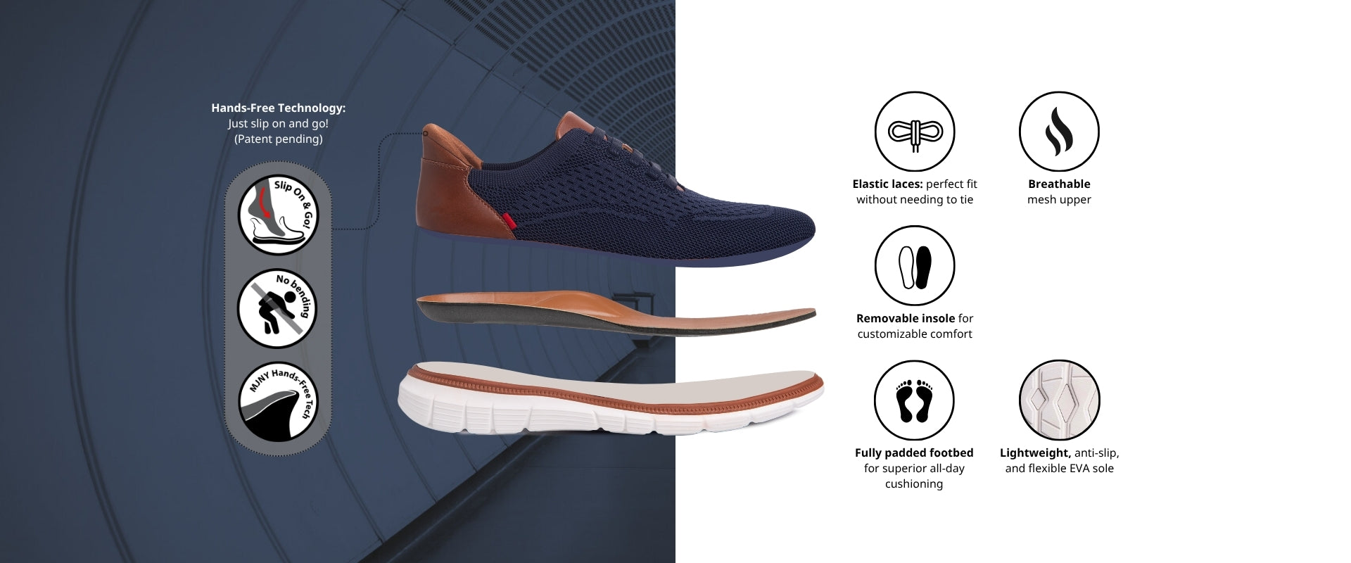 Step into effortless sophistication with the 'Edison St' sneaker, where cutting-edge innovation meets timeless design. Featuring Hands-Free Technology (Pending Patent) and elastic laces, these sneakers deliver a secure, hands-free fit—no bending, no tying, just pure convenience. The breathable knit upper, paired with premium accents, adds a modern edge to your wardrobe. Engineered with a lightweight, anti-slip EVA sole, the 'Edison St' provides supreme flexibility and a weightless feel, ensuring all-day comfort. Whether you're conquering the day or embracing casual downtime, these sneakers move seamlessly with you in style and confidence.