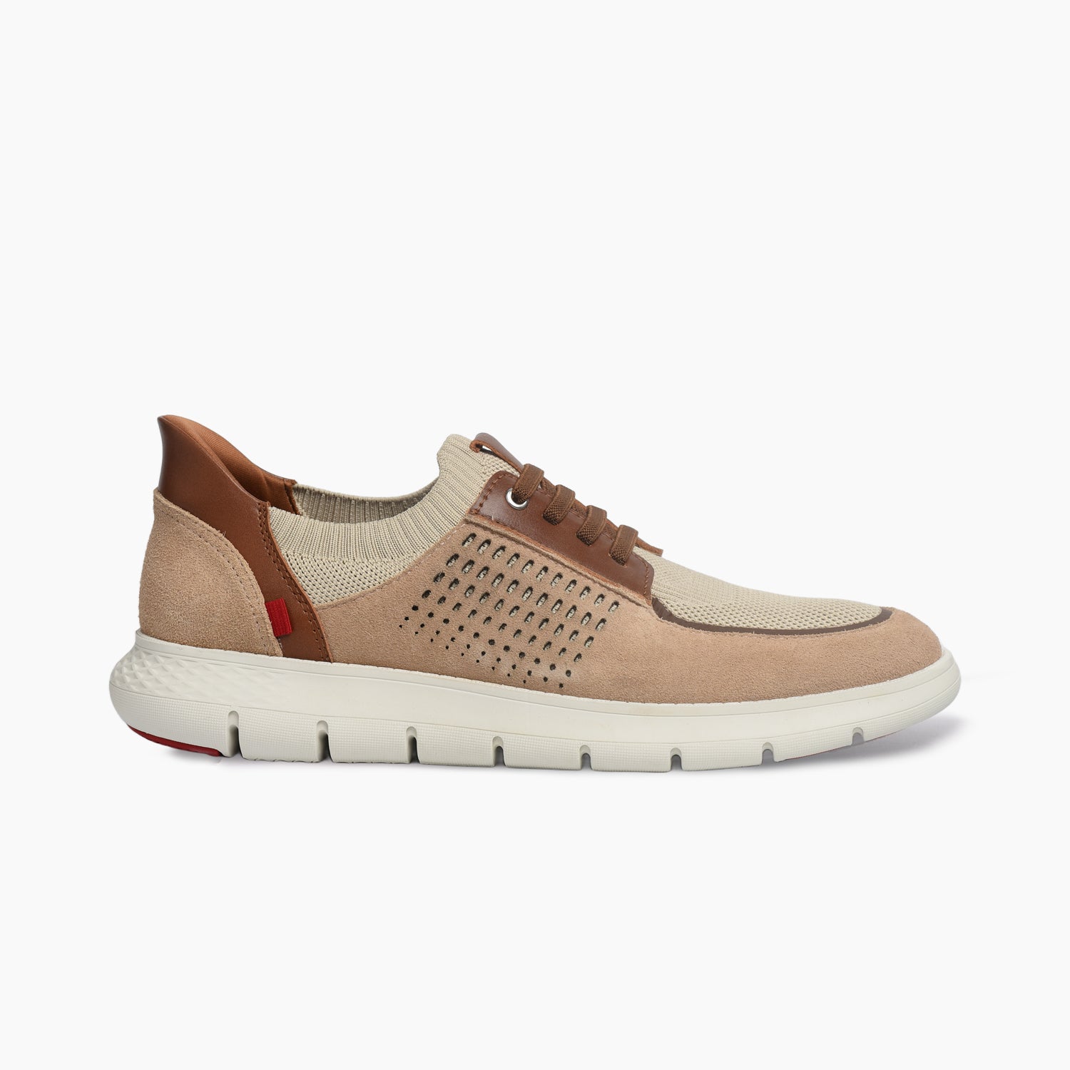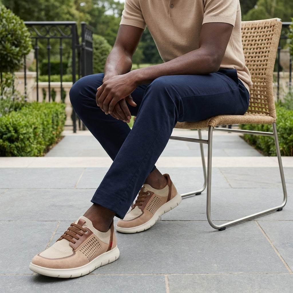 The 'Buffalo St' sneaker in beige presents a sophisticated fusion of modern comfort and relaxed elegance. Crafted with a refined combination of soft suede, breathable mesh textile, and smooth leather accents, it delivers rich texture and visual depth in a versatile neutral tone. The upper and lining are made from genuine calf leather, ensuring a supple feel, durability, and a premium interior finish. Featuring hands-free technology and elastic laces, it allows effortless slip-on convenience with a secure fit. A lightweight flexible outsole and cushioned footbed complete this design, offering exceptional all-day comfort with contemporary luxury appeal.