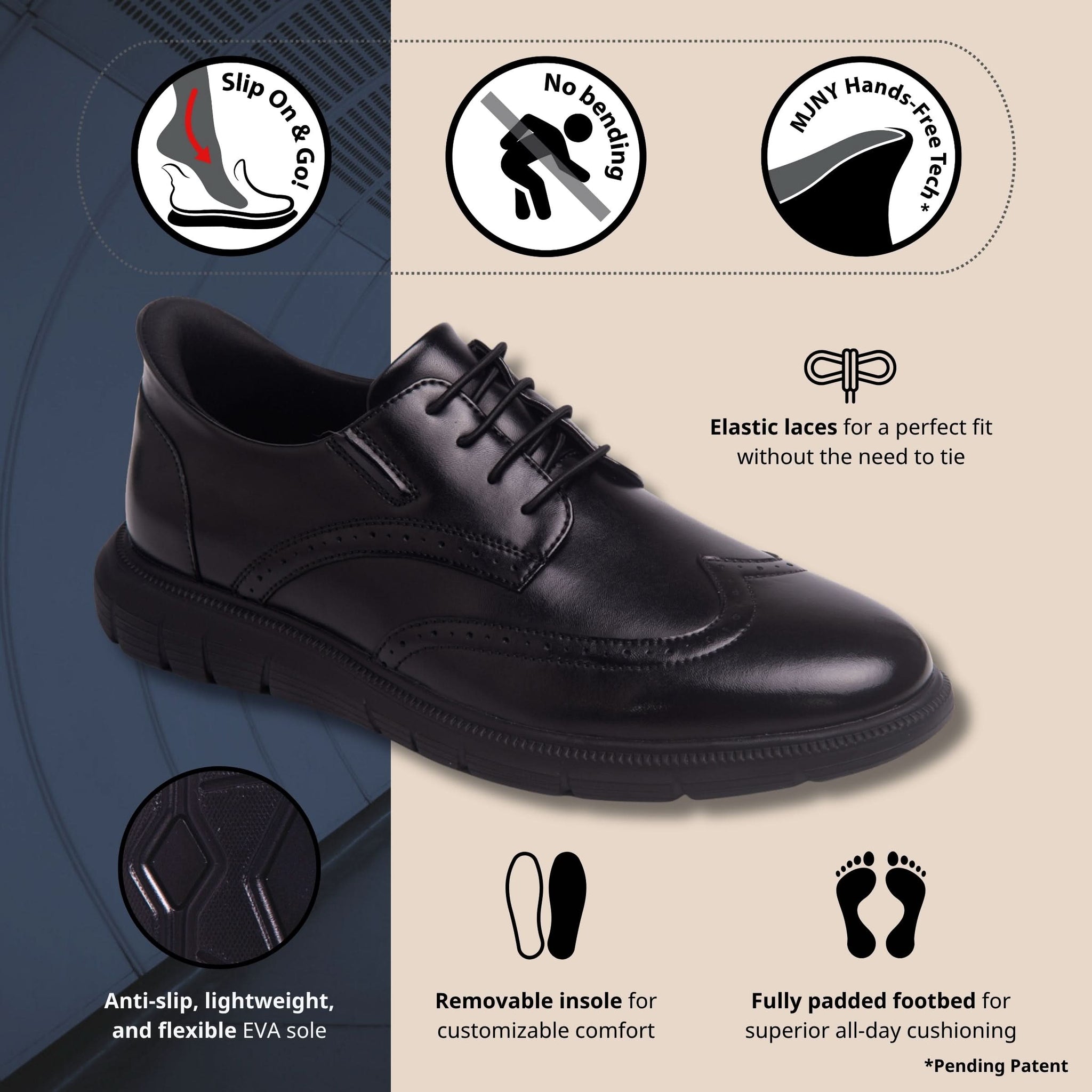 • Hands-Free Technology (Pending Patent): Slip-on convenience—no bending, pulling, or crushed heels