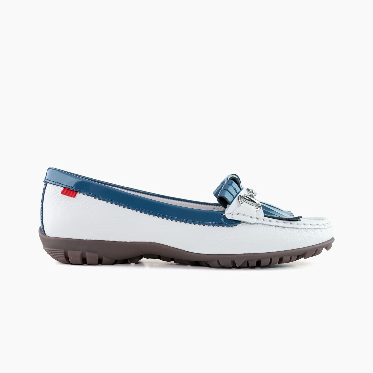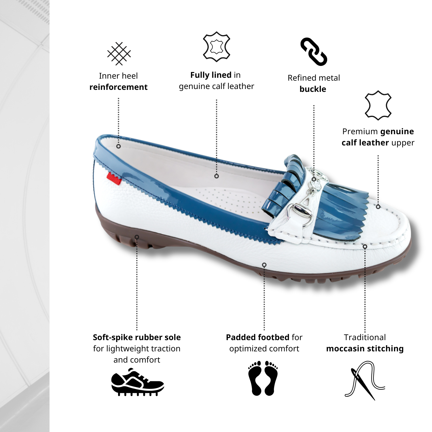 Designed for women who value polish and performance, this sleek moc silhouette features classic apron stitching, leather fringe, and a signature bit buckle—equally at home on the fairway, at the clubhouse, or out for the afternoon.