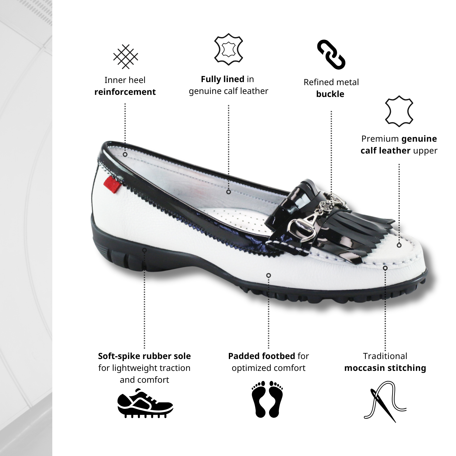 The Original Golf Moccasin! Renowned for our Luxury driving moccasins & Loafers this is a marriage of our expertise in the complex manufacturing technique of moccasins with a full line of Golf shoes. They consist of identical hand stitching & technology used in our Moccasins... but now on a stylish Golf shoe! An articulate exclusively designed soft spike rubber injected sole, developed for good traction on the green. Lightweight & superior comfort for versatile use on and off the course. The signature MJNY bit buckle and the fringe detail adds a unique touch to this Golf Moccasin.