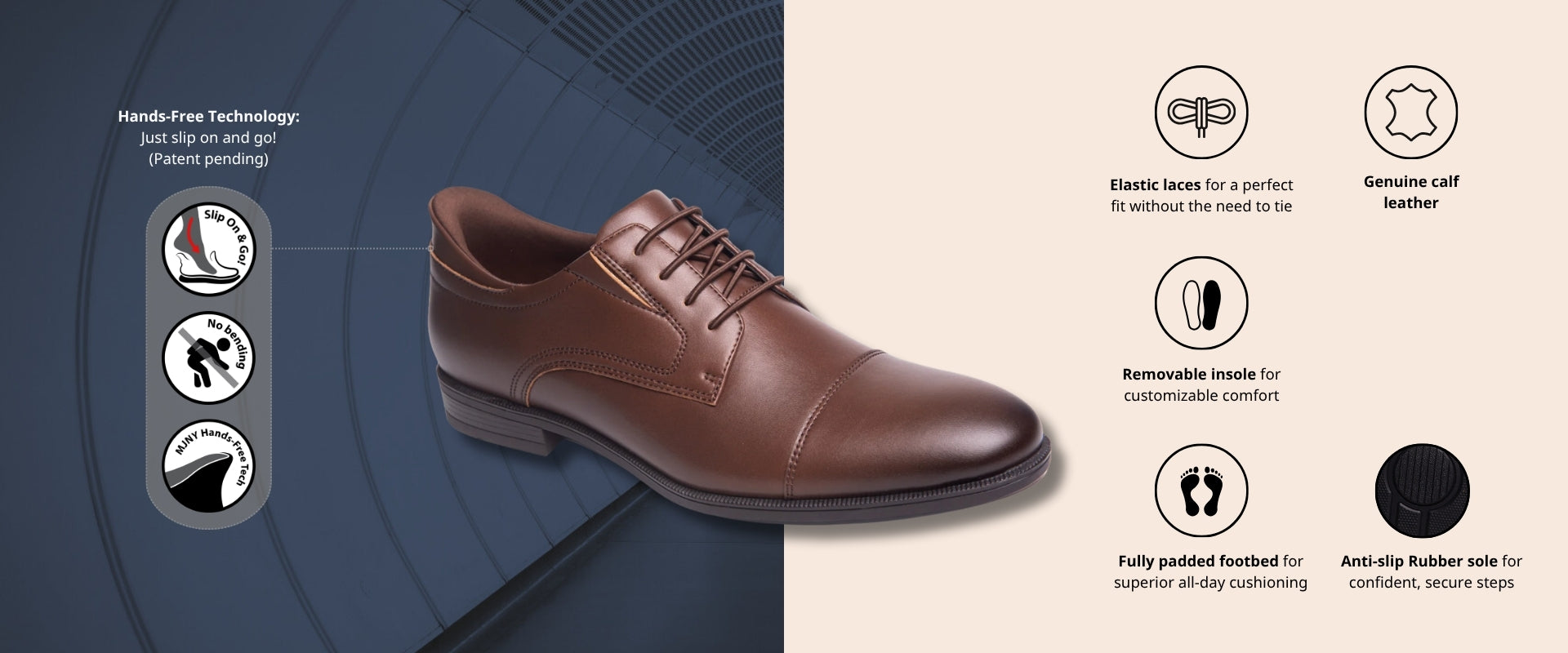 The 'Baker St' is a masterclass in modern sophistication—designed for the gentleman who values effortless elegance. Crafted with genuine calf leather inside and out, it delivers a luxurious feel that molds naturally to your foot over time. What sets this style apart is its discreet Hands-Free Tech and elastic laces—eliminating the need to bend, tie, or fuss. Just step in and go. Whether you're moving through airport lounges or office corridors, this shoe offers polished versatility with the comfort of all-day wear. It’s not just a shoe—it’s a daily upgrade.