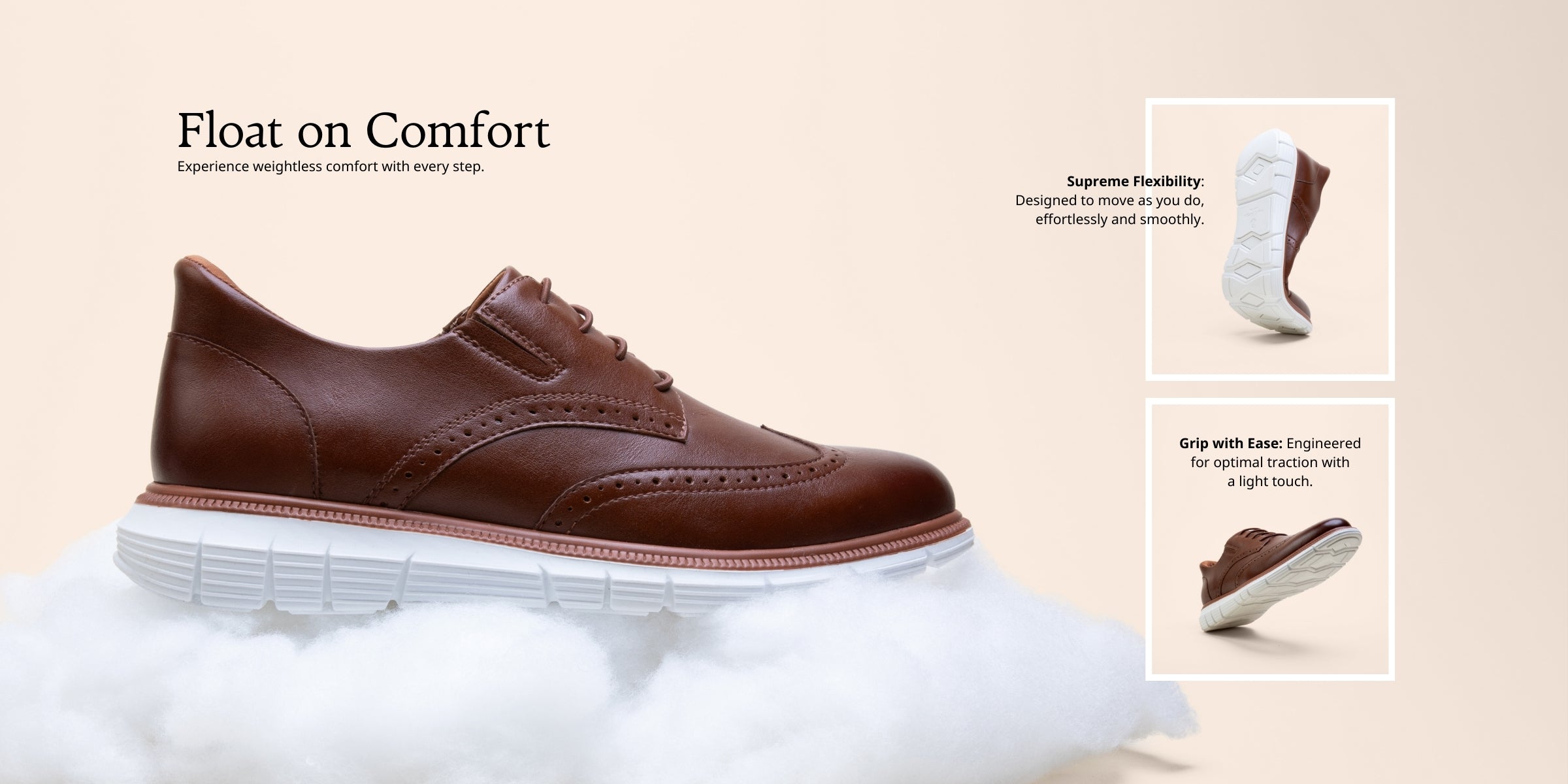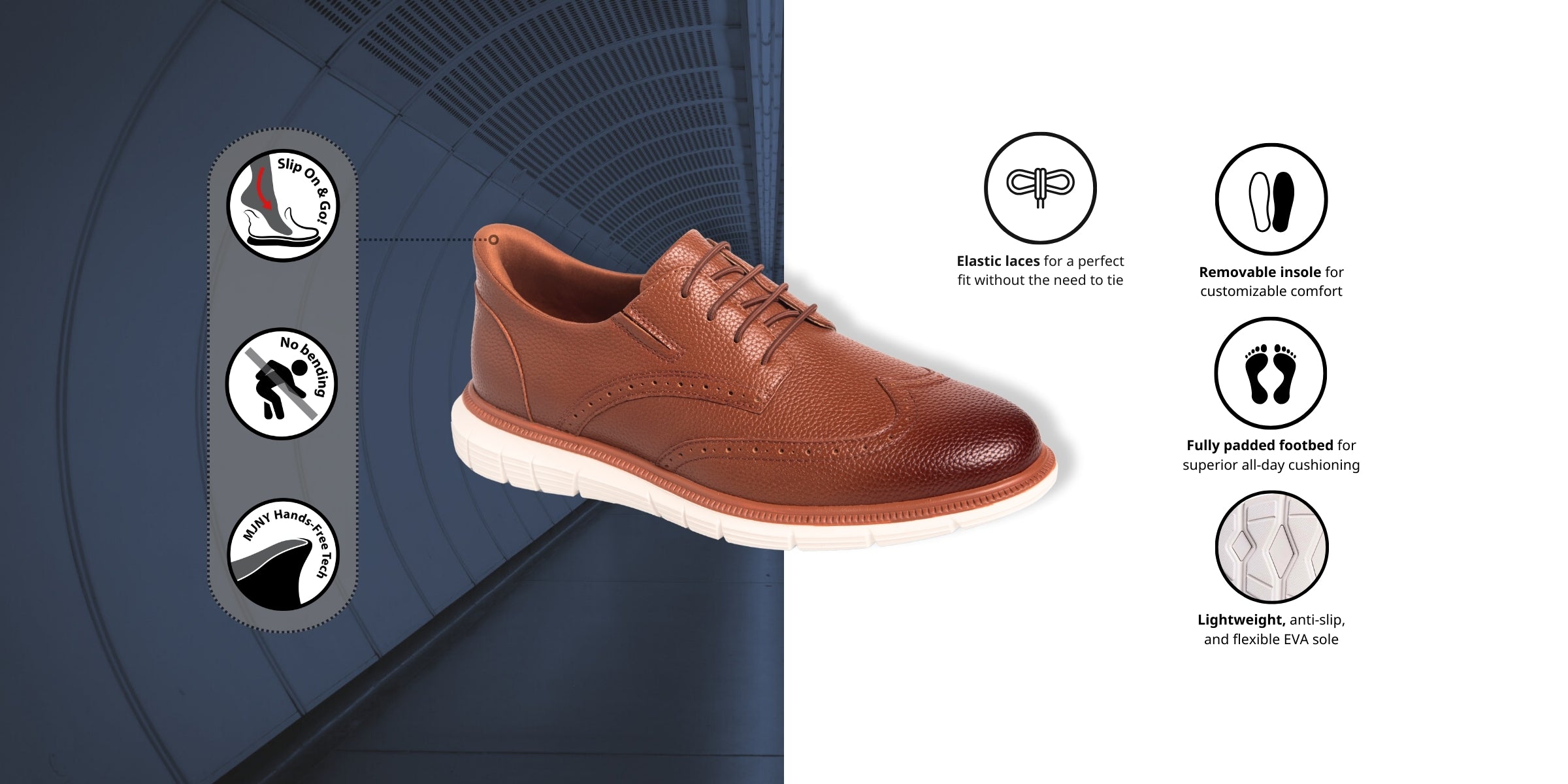 The 'Hill St' brings classic brogue elegance into the modern era with thoughtful innovation and sleek ease. Crafted for men who value sophistication without sacrificing comfort, it features Hands-Free technology and elastic laces that let you slip in effortlessly—no bending, no tugging. A feather-light sole ensures every stride feels easy and agile, while the refined wingtip detailing adds heritage appeal. This is the shoe that carries you from desk to dinner with confidence and unmistakable polish.