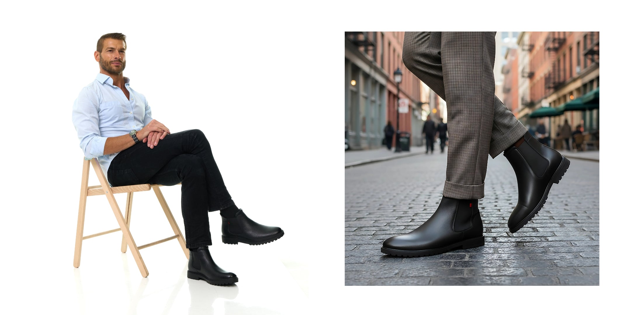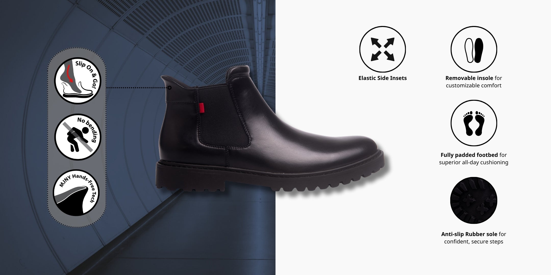 The 'Hudson Yards 2.0' is the world's first hands-free Chelsea boot, featuring our patent-pending Hands-Free Technology, design that lets you step in and out effortlessly—no bending, no tugging, just refined convenience. Crafted from premium genuine calf leather inside and out, it pairs timeless elegance with modern engineering. Elastic side panels ensure a precise fit, while a fully padded footbed and removable insole deliver custom, all-day comfort. Finished with an anti-slip rubber sole, it’s the ideal fusion of classic craftsmanship and innovative ease—for the man who expects more from every step.