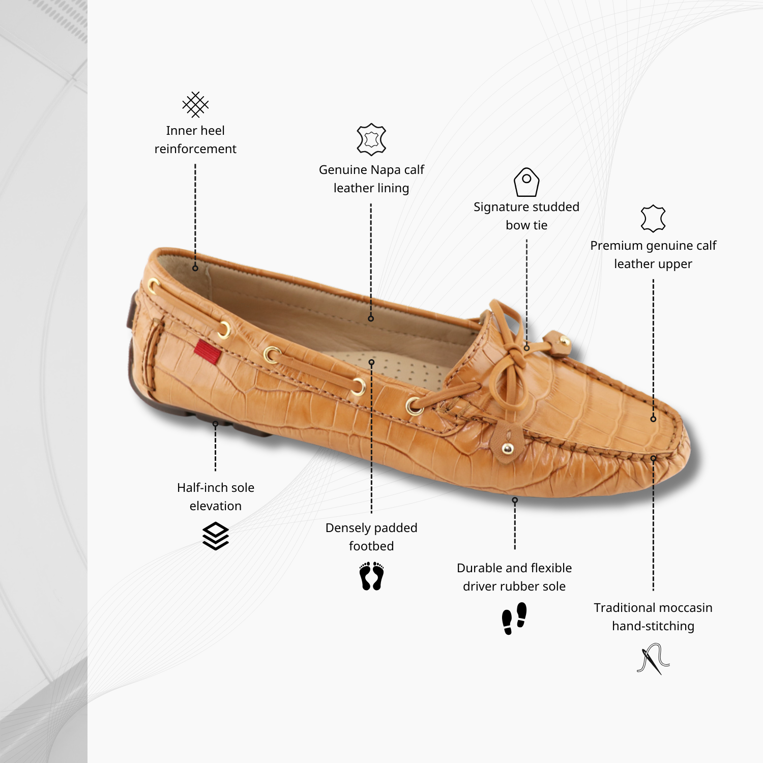 Designed in NYC and handcrafted in Brazil from genuine calf napa leather, inside and out. Traditional moccasin hand-stitching shapes a soft, glove-like fit. A gel heel insert and fully padded footbed absorb impact. The durable, flexible rubber driver sole with a ½-inch lift delivers quiet traction. Finished with a signature studded bow-tie, discreet tag, and emblazoned driver plug.