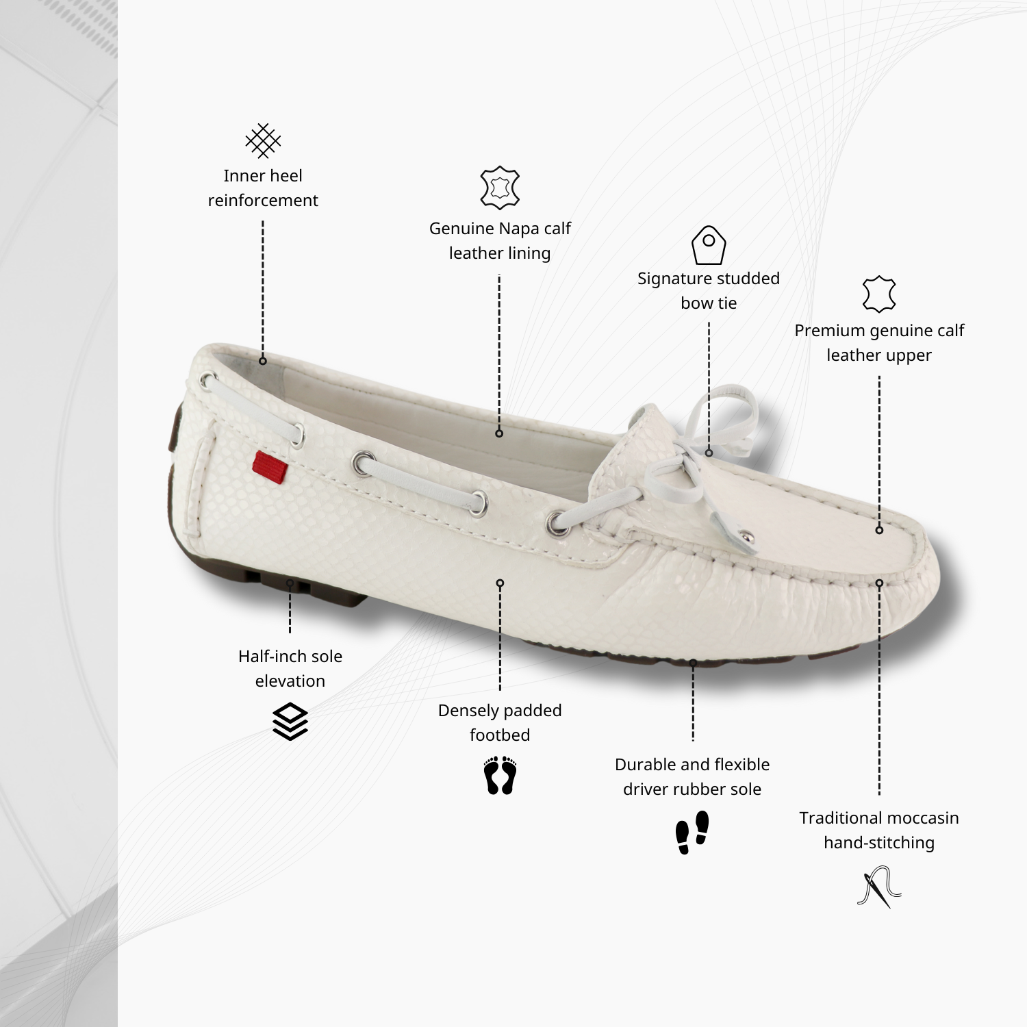 Designed in NYC and handcrafted in Brazil from genuine calf napa leather, inside and out. Traditional moccasin hand-stitching shapes a soft, glove-like fit. A gel heel insert and fully padded footbed absorb impact. The durable, flexible rubber driver sole with a ½-inch lift delivers quiet traction. Finished with a signature studded bow-tie, discreet tag, and emblazoned driver plug.