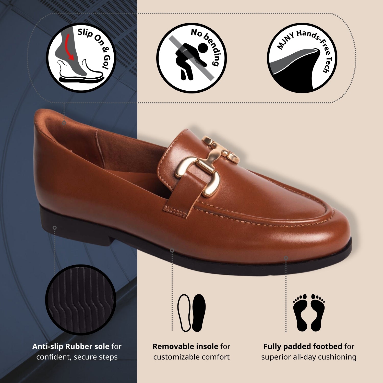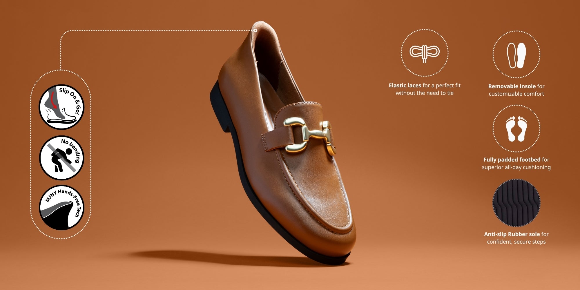 The 'Avery St' redefines everyday elegance with a modern twist. Crafted from genuine calf leather and elevated by a sleek horsebit accent, this loafer delivers sophistication without sacrificing ease. Designed with revolutionary hands-free technology (patent pending), it lets you glide in and out effortlessly—no bending, no fuss. Whether powering through meetings or stepping out for the evening, the 'Avery St' blends polished refinement with unparalleled convenience. For the discerning woman who demands both style and innovation, this is footwear that moves with you—flawlessly.