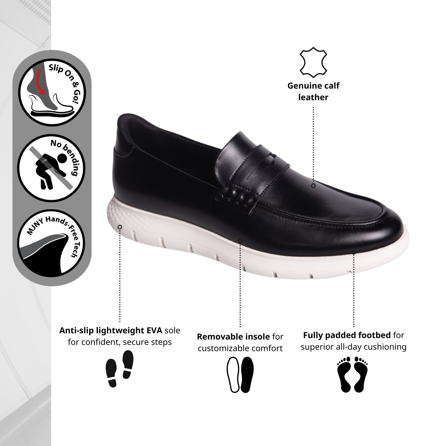 The Douglas St casual penny loafer redefines modern convenience and style with its revolutionary Hands-free Technology (Pending Patent) —offering a seamless, just Slip On experience. Featuring a lightweight, anti-slip EVA sole, this loafer is engineered for supreme flexibility and all-day comfort. Designed to adapt to your every step, it delivers a weightless feel that keeps you moving effortlessly. Perfectly balancing contemporary design with practicality, the sleek profile elevates your look while ensuring durability and ease. Ideal for the modern man who values both sophistication and everyday functionality.