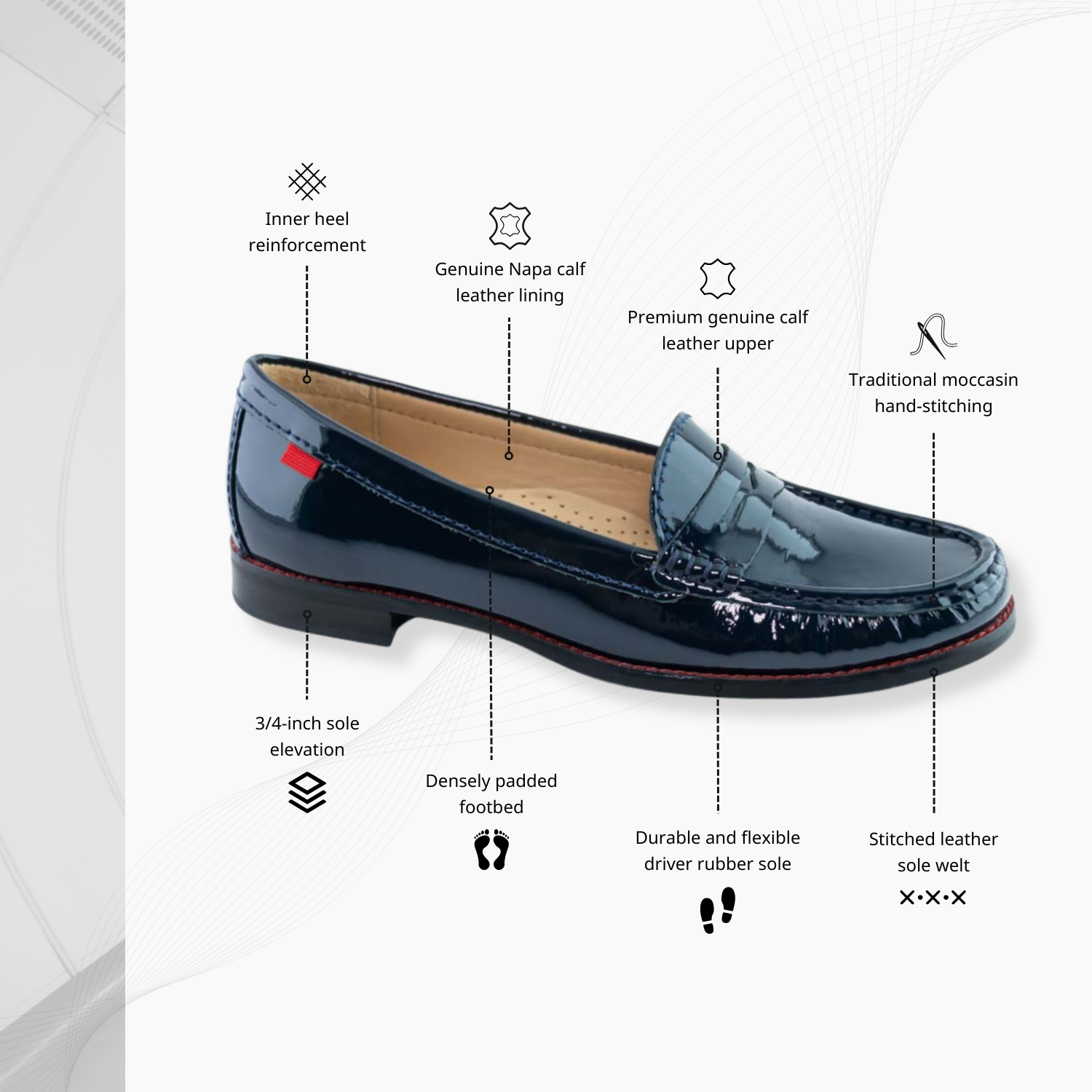 The East Village loafer is our best-selling women’s icon, celebrated for effortless style and enduring appeal. Designed in NYC and handcrafted in Brazil, its high-gloss Navy Patent finish brings modern polish to a timeless silhouette. The upper and full lining are crafted from genuine calf leather, delivering a supple feel and refined durability. Inside, a luxuriously dense padded footbed offers exceptional all-day comfort, while traditional hand-stitched moccasin detailing reflects true artisanal craftsmanship. Finished with a flexible rubber sole, a ¾-inch stacked heel, and our distinctive red tag, it’s a flawless balance of style and soul.