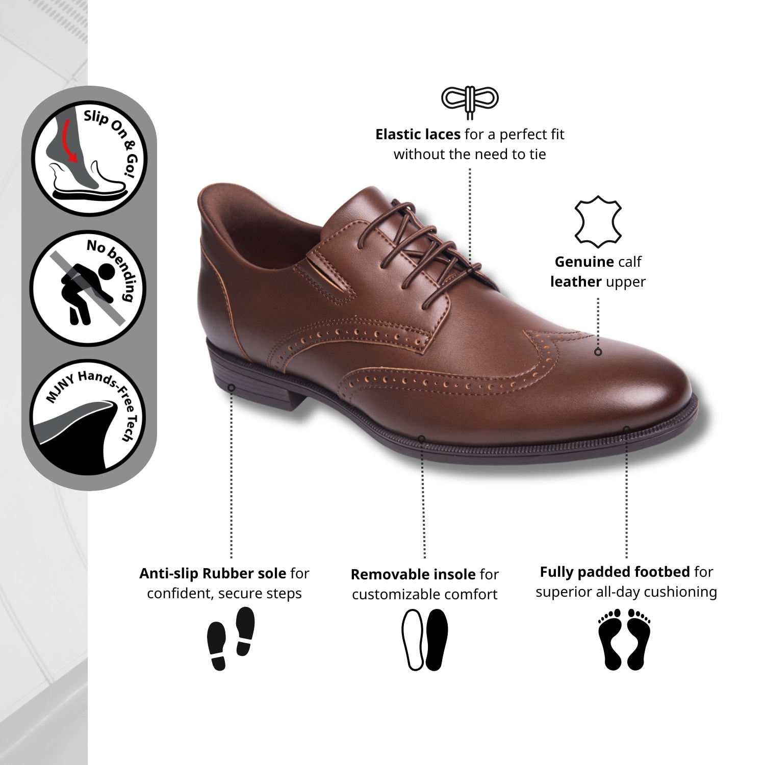 The 'Howard St' blends timeless Oxford elegance with modern innovation, delivering a shoe that is as functional as it is refined. Expertly crafted in genuine calf leather, both upper and lining, it offers supple comfort and enduring quality that elevates every step. Enhanced with Hands-Free Tech and elastic laces, this style allows effortless slip-on convenience while preserving a clean, traditional lace-up look. With its classic wingtip detailing and contemporary ease, the 'Howard St' is designed for men who appreciate heritage craftsmanship without compromising on everyday practicality.
