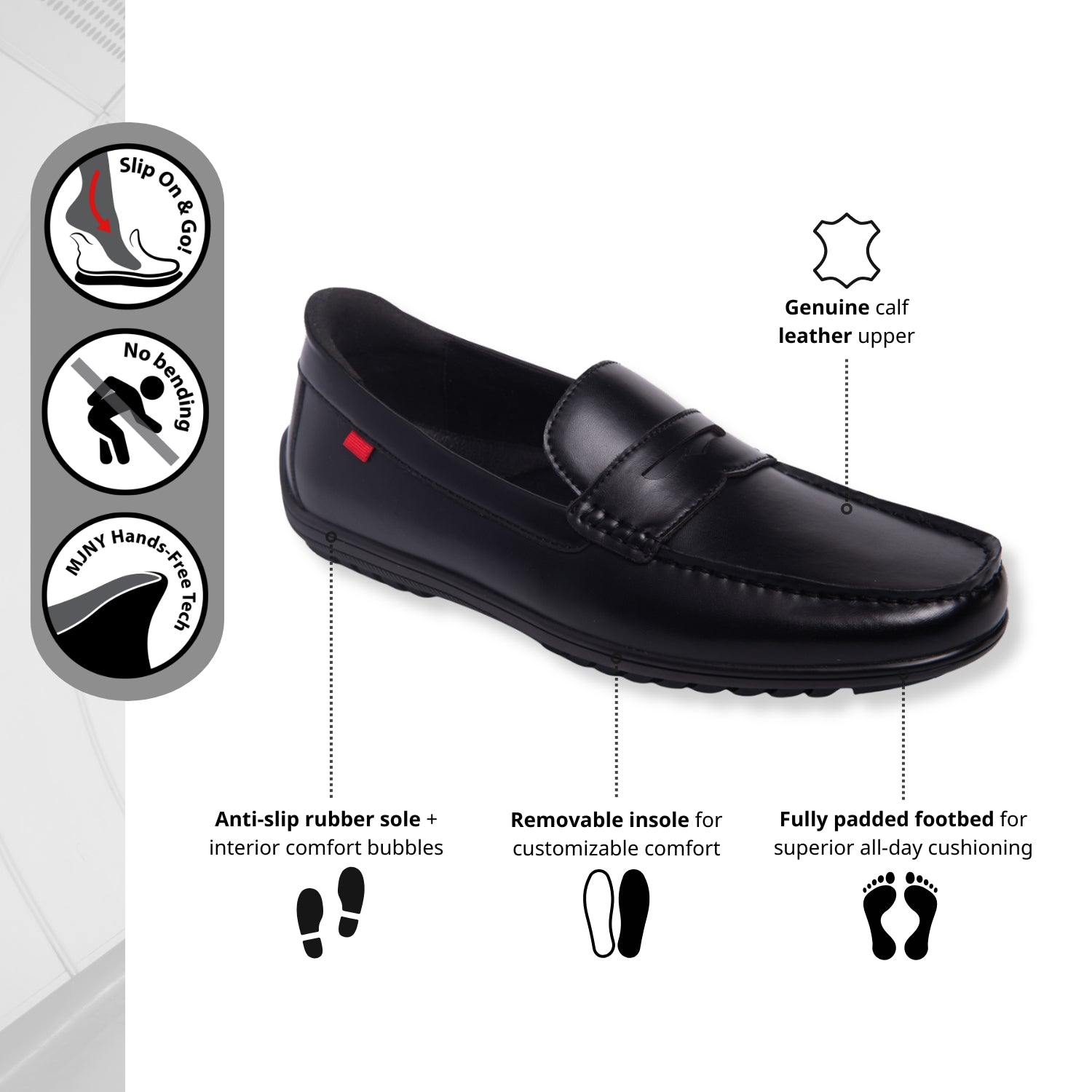 The John St loafer combines timeless elegance with modern convenience. Featuring innovative Hands-Free Technology (Pending Patent), this slip-on design lets you slip on effortlessly—no bending, pulling, or heel crushing. The padded ankle and cushioned footbed deliver superior comfort for all-day wear, while the classic penny loafer design adds a touch of refined sophistication. Perfect for the discerning gentleman, this versatile style transitions seamlessly from casual outings to professional settings. Crafted with premium materials for durability and easy maintenance, the John St loafer is where tradition meets innovation.