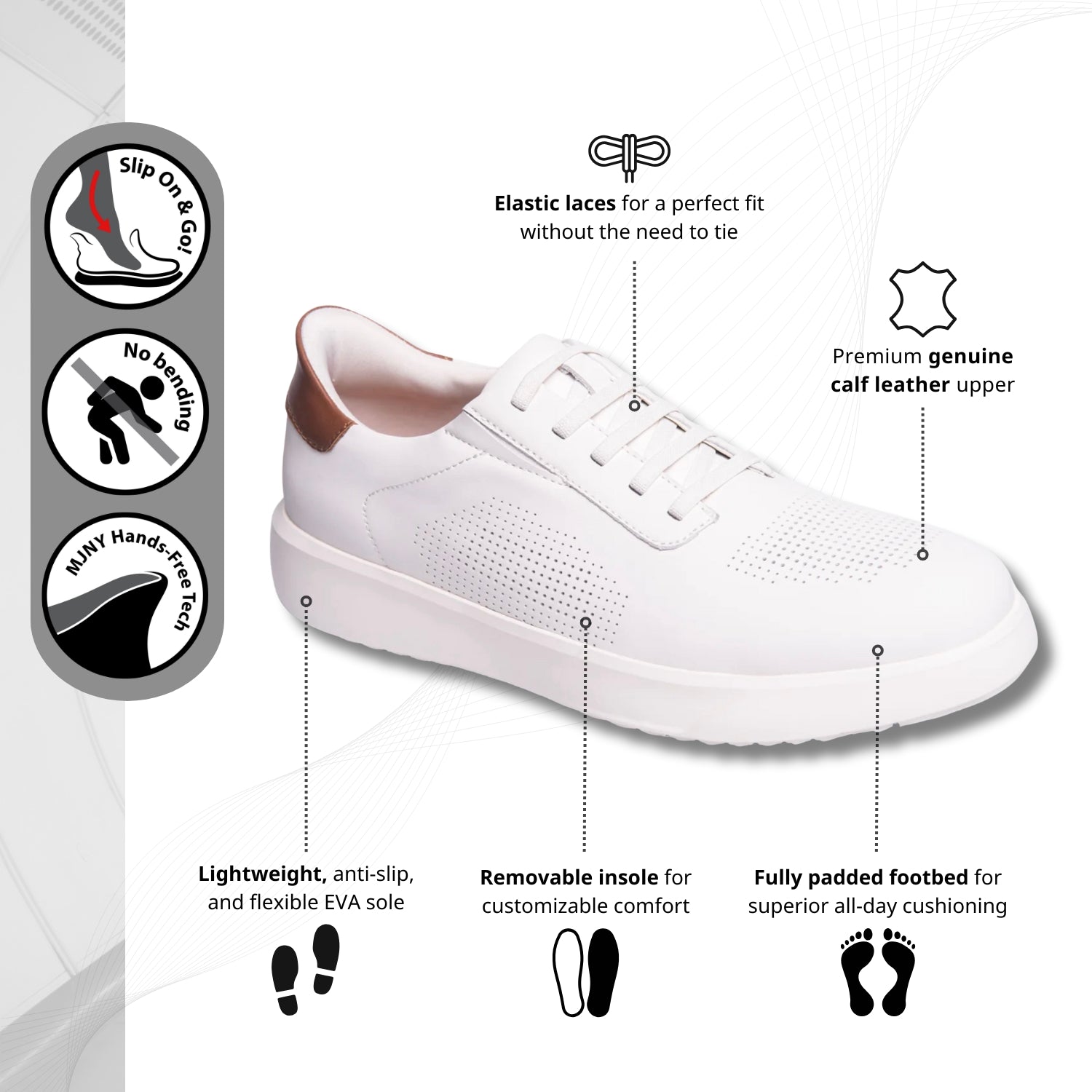 The 'Harbor Rd' is where minimalist design meets purposeful innovation. Built for fluid, everyday motion, it features Hands-Free (Patent pending) entry for seamless wear, a lightweight sole engineered to reduce fatigue, and elastic laces that adapt to your stride without ever needing to be tied. Wrapped and lined in supple genuine calf leather, it balances form and function with quiet confidence. Whether you're dressing up or paring down, this is the sneaker that effortlessly keeps pace—discreetly smart, undeniably refined.