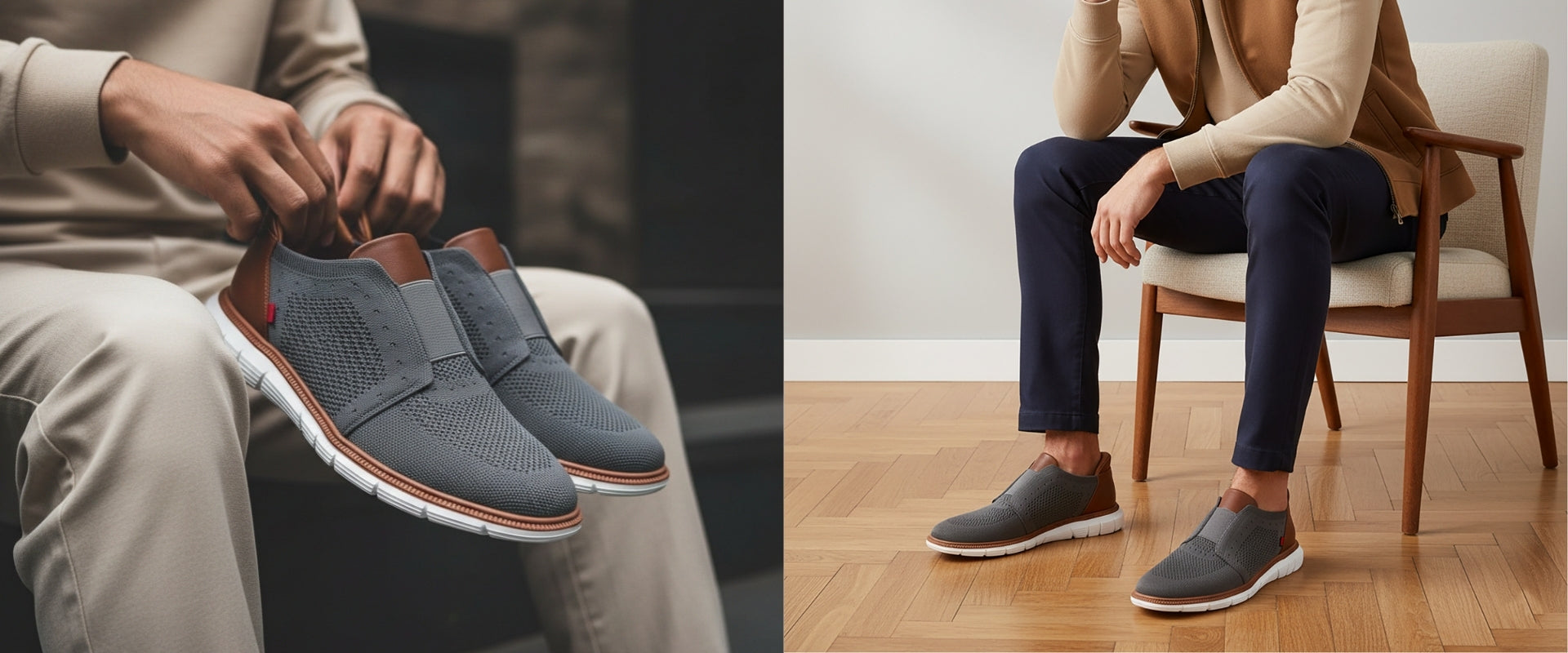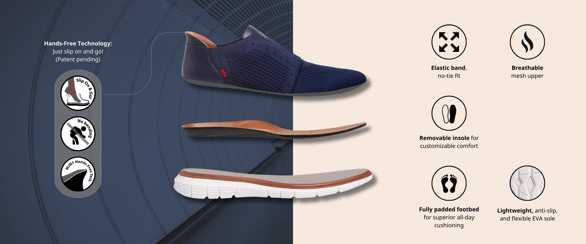 The 'South St' is where timeless sophistication meets effortless innovation. Designed for men who move fast and live sharp, this Hands-Free slip (Patent pending)-on merges breathable mesh with supple genuine calf leather in both the upper and lining—offering flexibility without sacrificing refinement. A feather-light sole adds all-day comfort, while its streamlined silhouette delivers a modern edge. Whether you're catching a flight or heading to brunch, the 'South St' ensures you do it in style—no laces, no hassle, just pure elevated ease. Slip in, stand out.