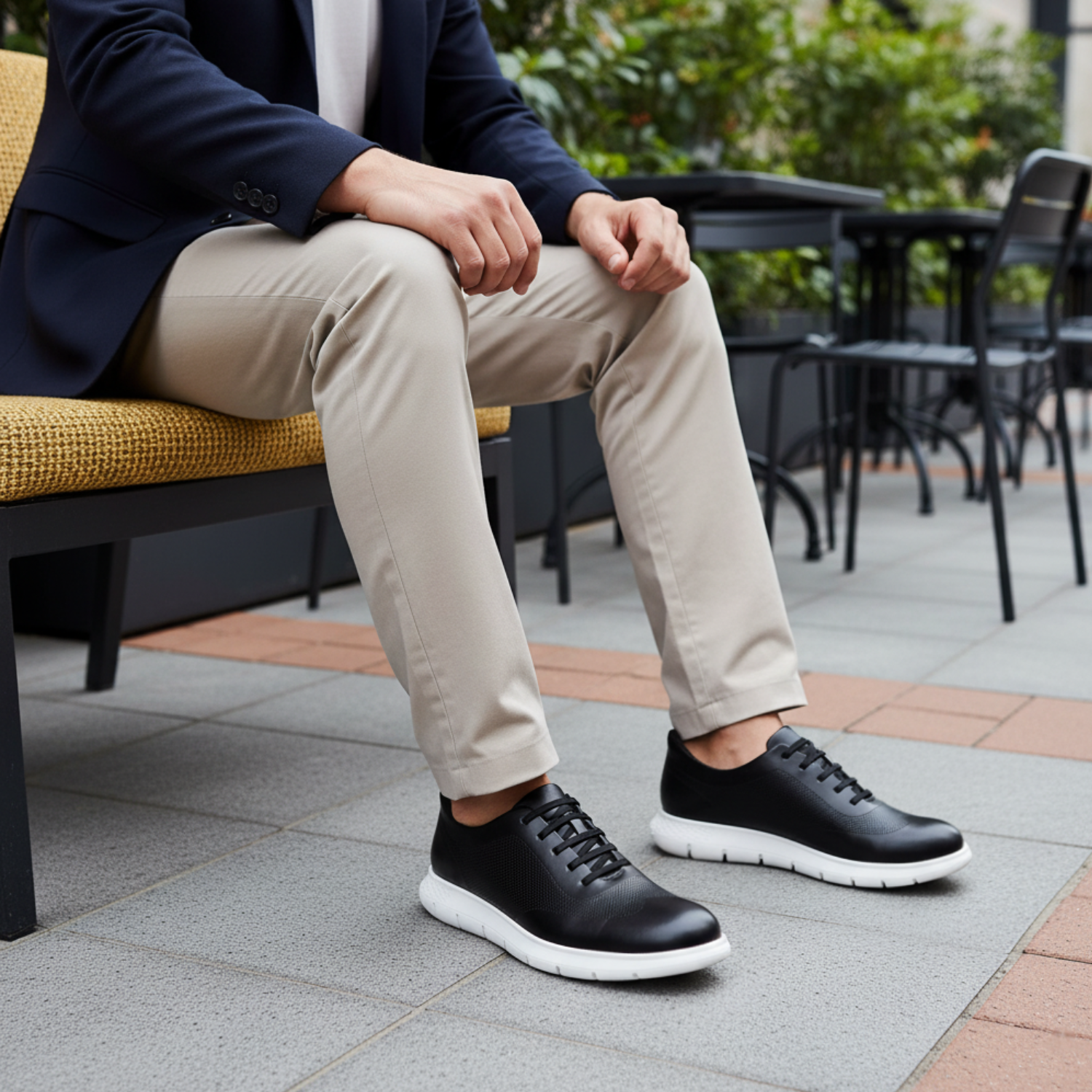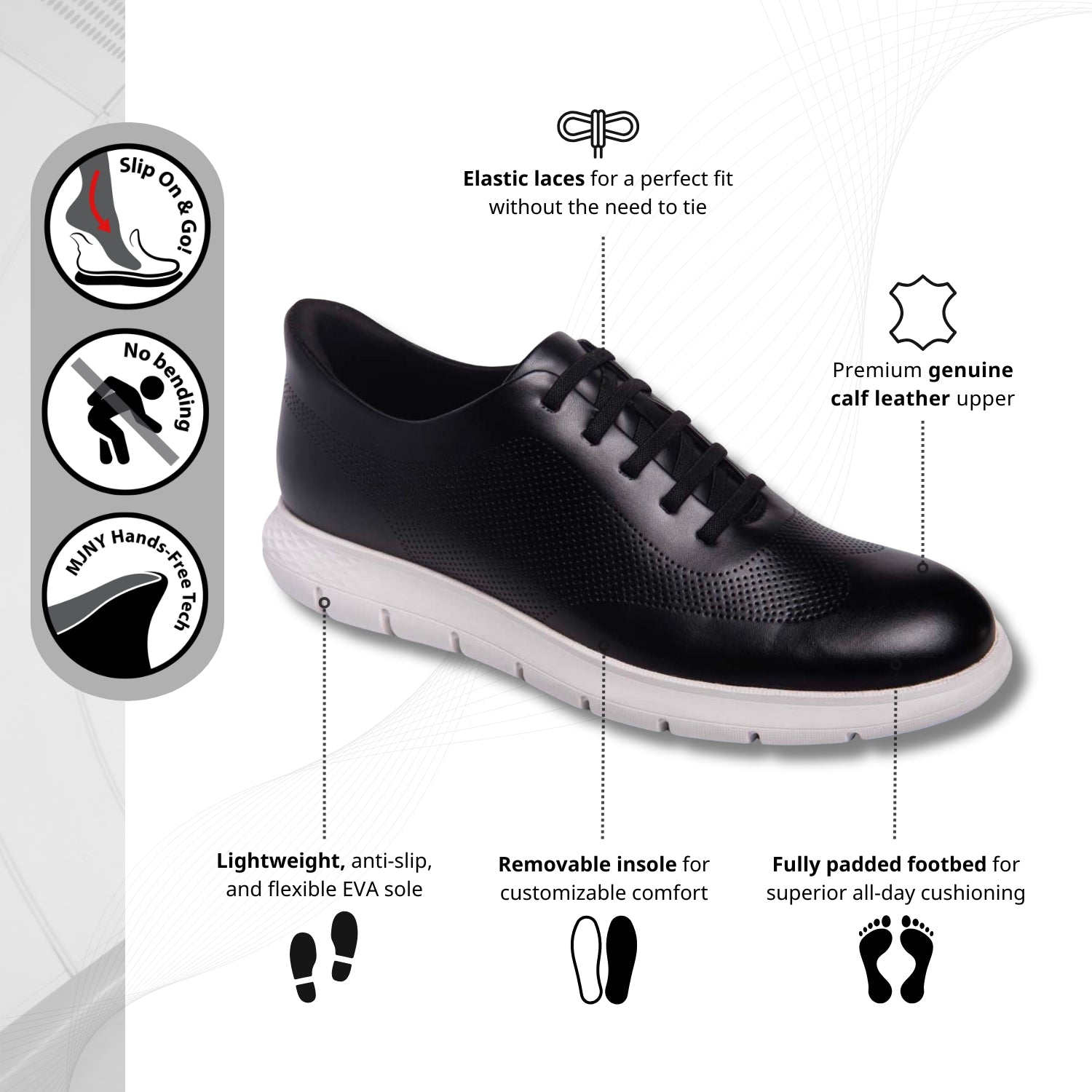 Elevate your everyday style with the Gold St. Sneaker, a perfect blend of sophistication and practicality. Crafted with genuine calf leather in both the upper and lining, these sneakers exude timeless luxury while ensuring superior comfort. The lightweight, anti-slip, and flexible EVA sole moves effortlessly with you, offering unmatched flexibility and support. Designed with revolutionary hands-free technology (Pending Patent), it provides the ultimate convenience of a seamless slip-on experience. Breathable perforation enhances airflow, keeping your feet fresh all day. These sneakers are ideal for those who demand premium craftsmanship and effortless style in every step.