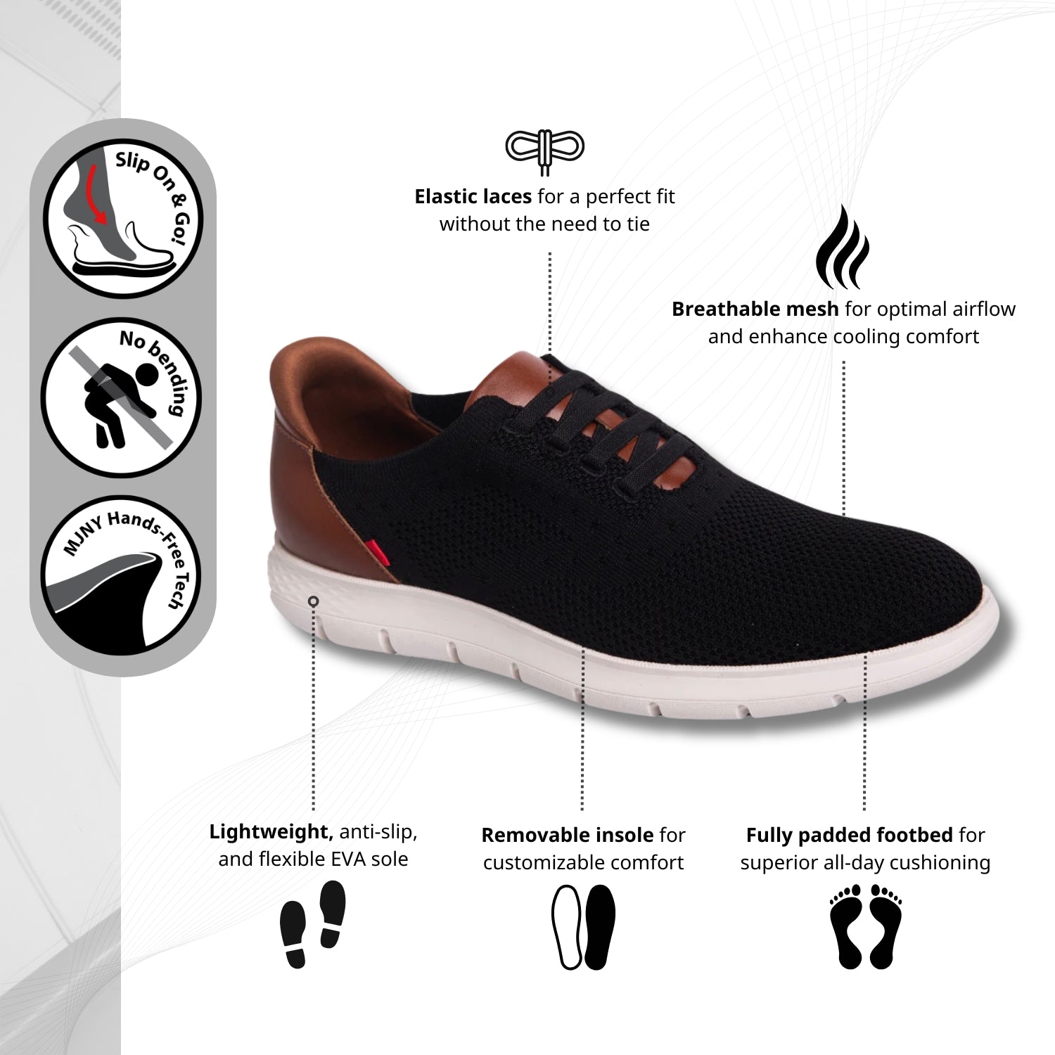 Step into effortless sophistication with the Victory St sneaker, where cutting-edge innovation meets timeless design. Featuring Hands-Free Technology (Pending Patent) and elastic laces, these sneakers deliver a secure, hands-free fit—no bending, no tying, just pure convenience. The breathable knit upper, paired with premium accents, adds a modern edge to your wardrobe. Engineered with a lightweight, anti-slip EVA sole, the Victory St provides supreme flexibility and a weightless feel, ensuring all-day comfort. Whether you're conquering the day or embracing casual downtime, these sneakers move seamlessly with you in style and confidence.