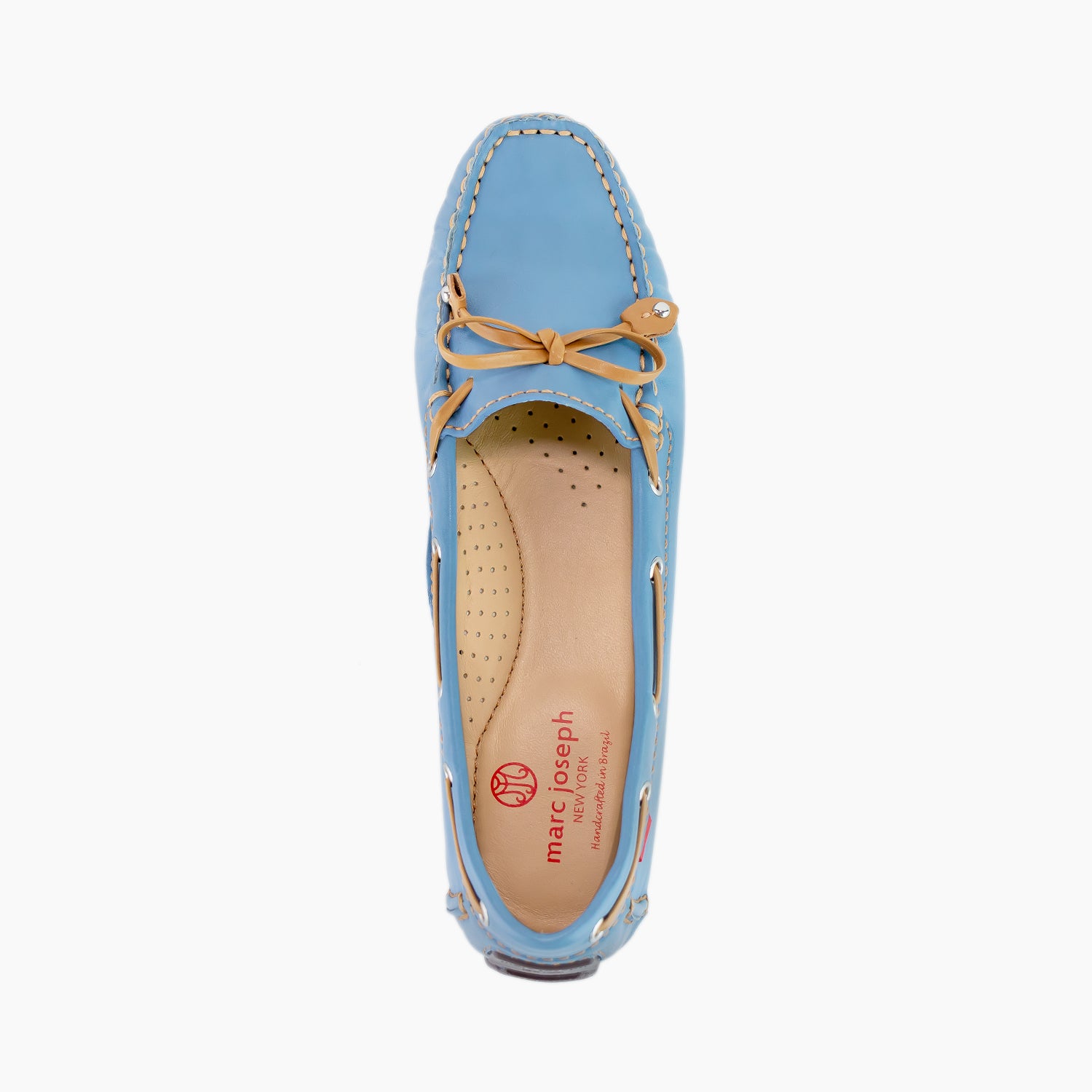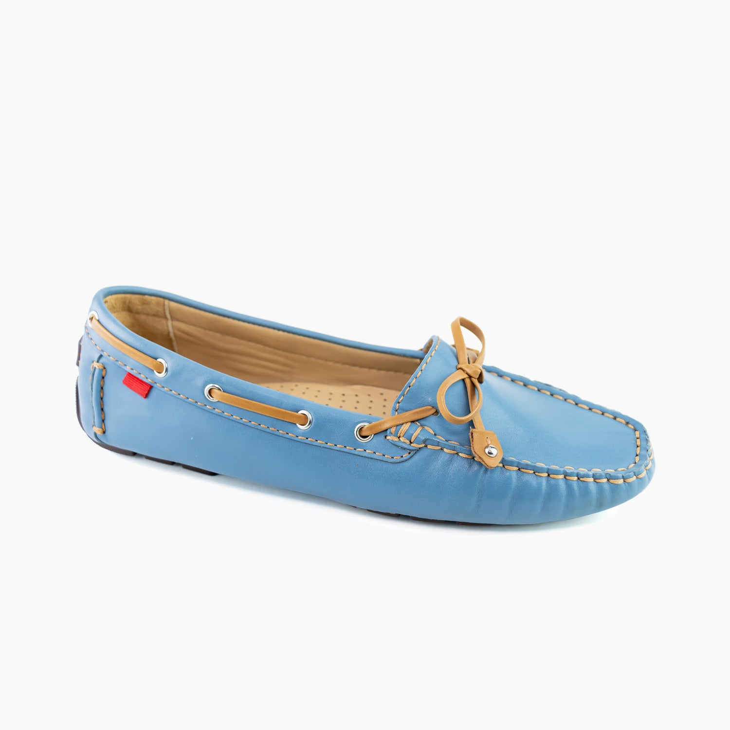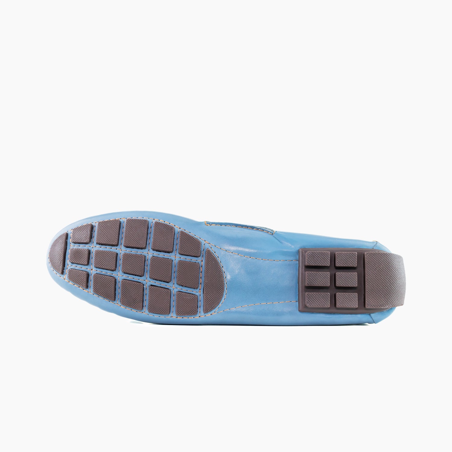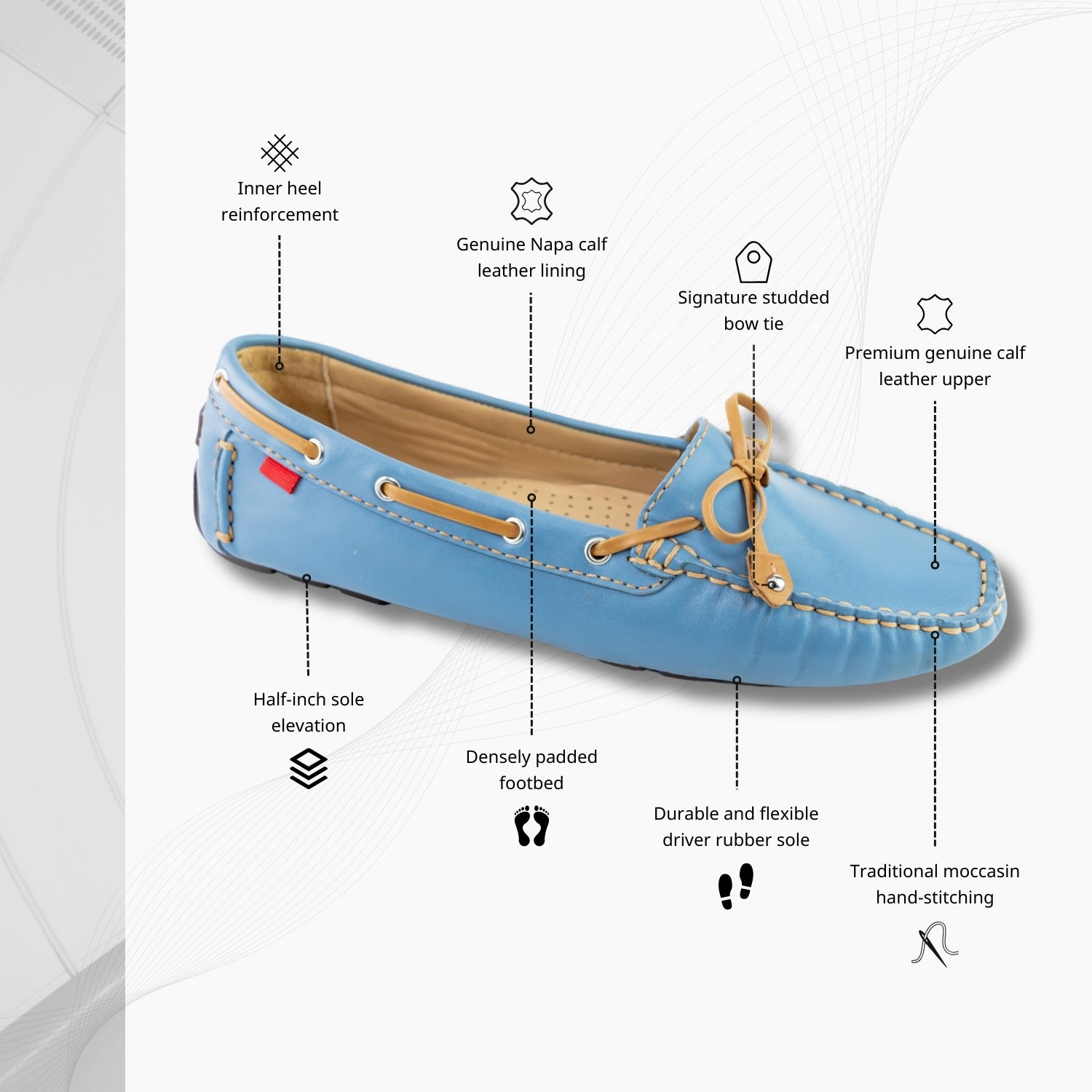 The 'Cypress Hill' is a refined expression of effortless luxury, crafted for those who appreciate understated elegance. Rendered in a serene sky-blue hue, its upper in genuine calfskin leather reveals a smooth, supple Napa texture that speaks to superior craftsmanship. The interior, fully lined in genuine calfskin leather, embraces the foot with breathable softness, while a densely padded footbed ensures lasting comfort. Finished with a flexible rubber driver sole for confident traction and a delicate tie-bow detail, this silhouette delivers timeless style designed to be collected and worn season after season.
