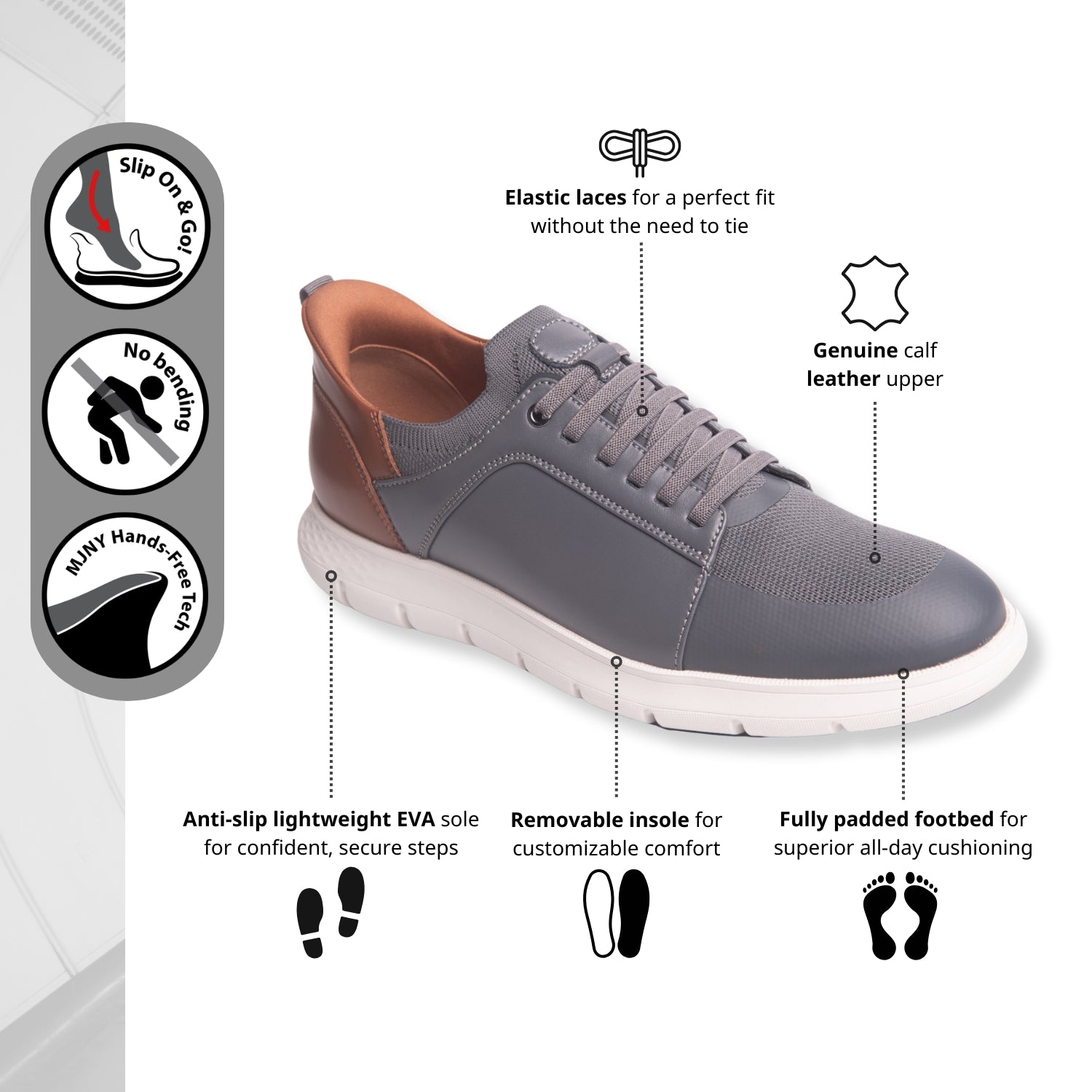 The 'Newbury St' is crafted for the man who demands ease without sacrificing elegance. Its Hands-Free (Patent pending) design lets you step in and out with zero effort—no bending, no fuss. The featherweight sole cushions every stride while reducing fatigue, and elastic laces offer a tailored fit that flexes with your movement. Lined and wrapped in genuine calf leather, this sneaker delivers comfort and polish in equal measure—an everyday essential designed to move as effortlessly as you do.