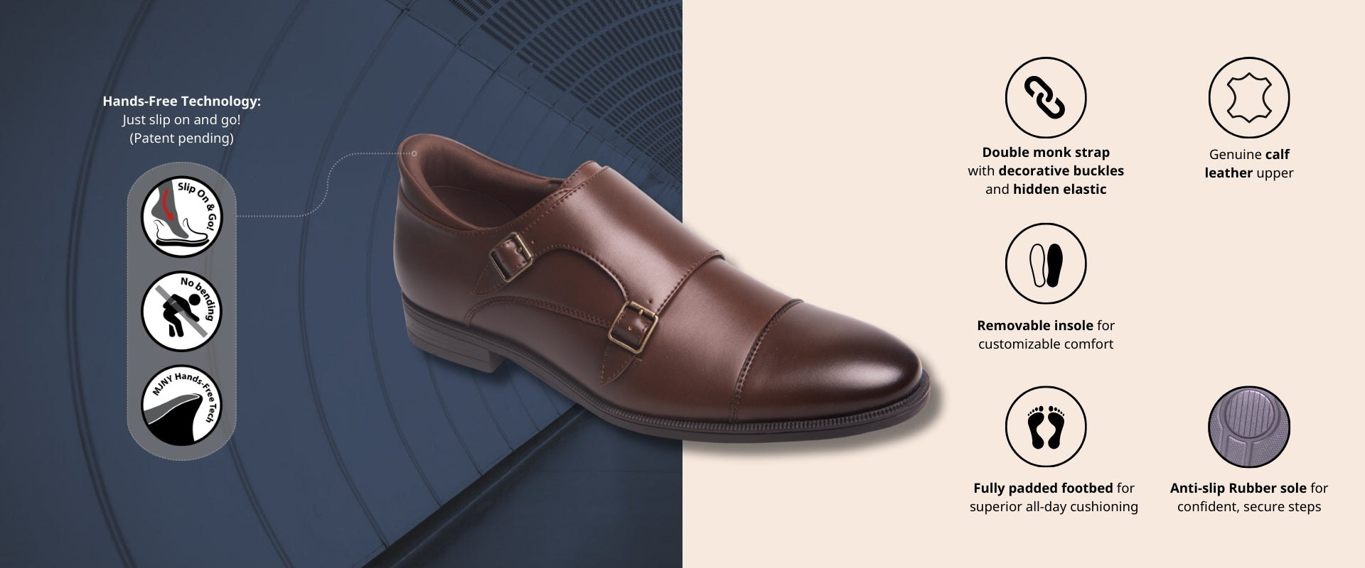 The 'Oliver St' takes the timeless double monk silhouette and upgrades it with a modern secret—Hands-Free (Patent pending) entry that slips on with zero fuss. No buckles to fasten, no time wasted. Hidden elastic beneath the straps provides a snug, secure fit, keeping the elegant look intact while delivering effortless wear. Crafted in genuine calf leather, this refined design bridges old-world charm and everyday practicality. It’s tradition—quietly reengineered for now.