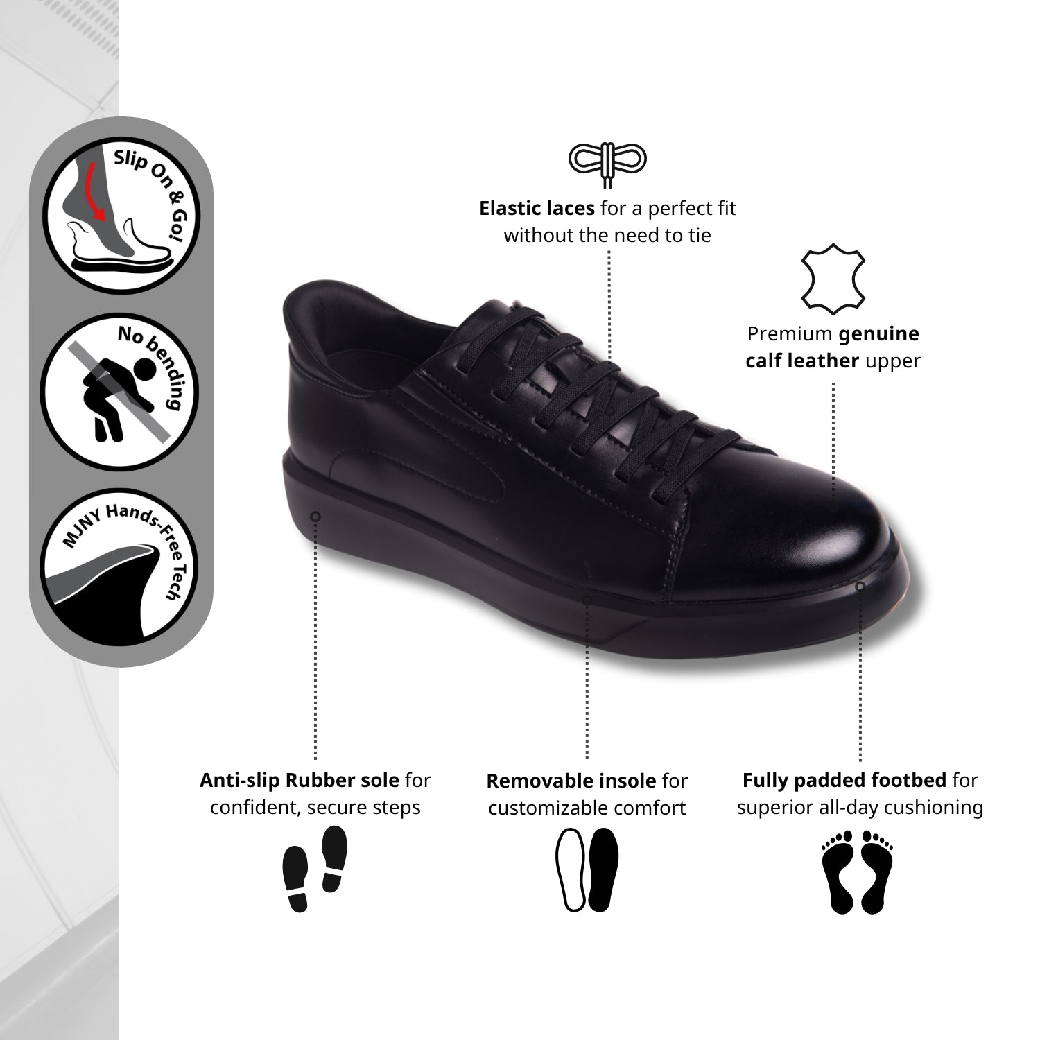 The 'River St' is where modern innovation meets timeless sophistication. Crafted with genuine calf leather inside and out, this elevated sneaker is designed for the man who moves effortlessly through his day. Featuring patent-pending Hands-Free Tech and elastic laces, slipping into comfort has never been smoother—no bending, no fuss. Beneath the sleek exterior lies a smart design built for all-day support, merging luxury with everyday functionality. It’s not just a sneaker—it’s your invitation to stride with purpose and ease.