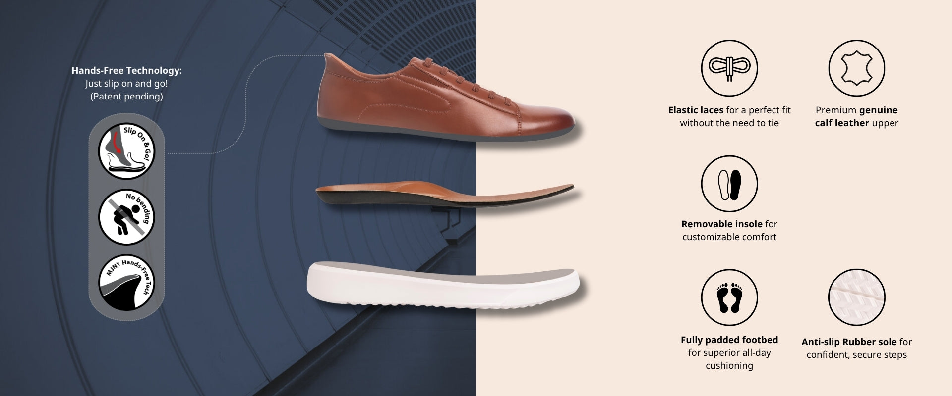 • Hands-Free tech (patent pending): slip-on, no bending, no heel-crush