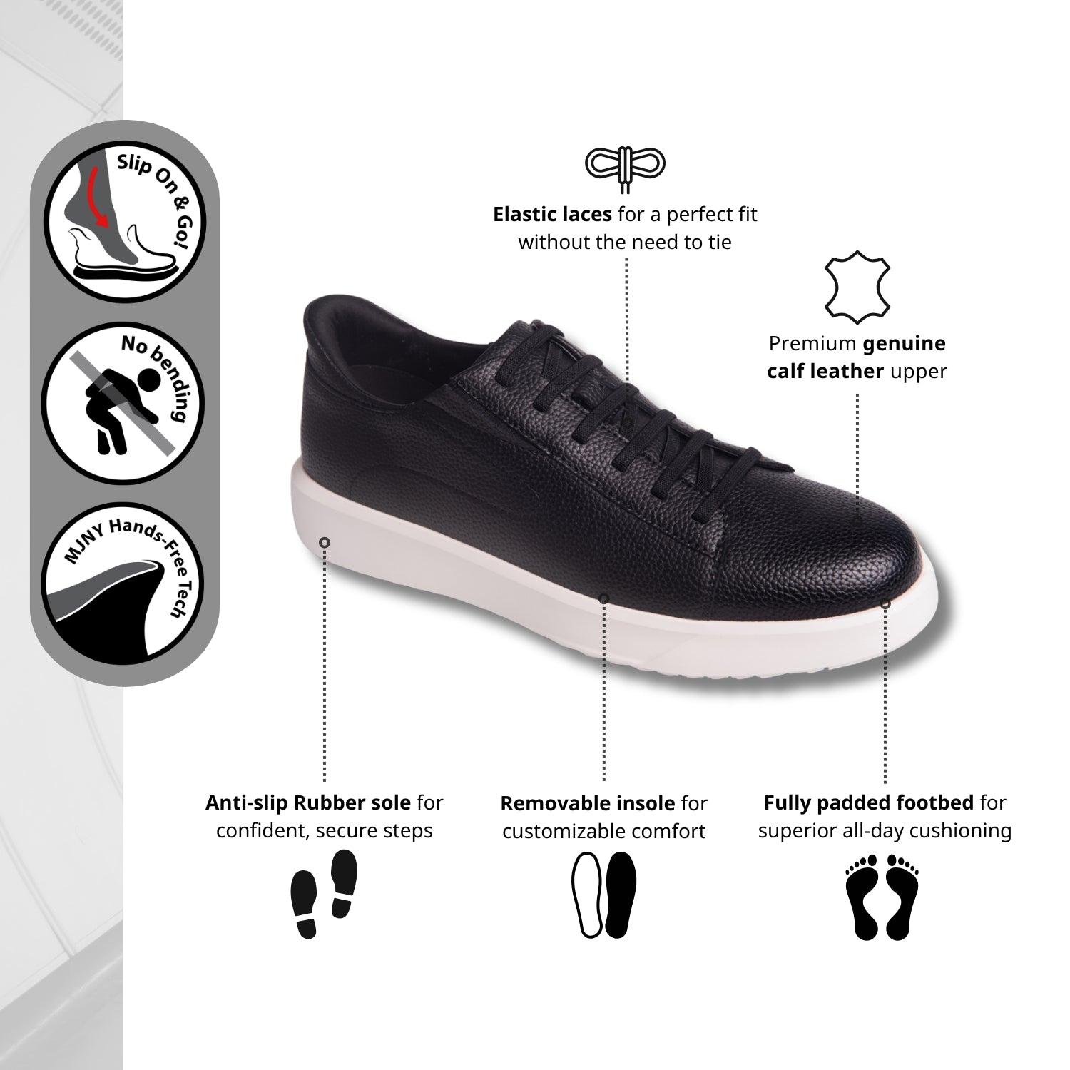The 'River St' is where modern innovation meets timeless sophistication. Crafted with genuine calf leather inside and out, this elevated sneaker is designed for the man who moves effortlessly through his day. Featuring patent-pending Hands-Free Tech and elastic laces, slipping into comfort has never been smoother—no bending, no fuss. Beneath the sleek exterior lies a smart design built for all-day support, merging luxury with everyday functionality. It’s not just a sneaker—it’s your invitation to stride with purpose and ease.
