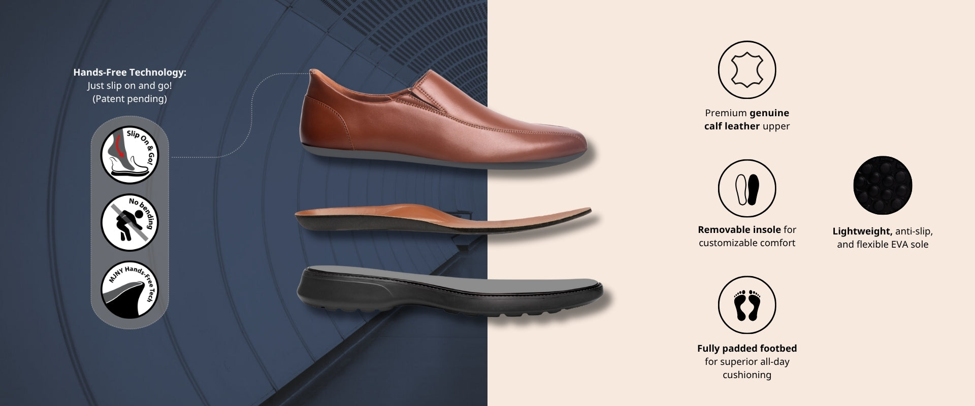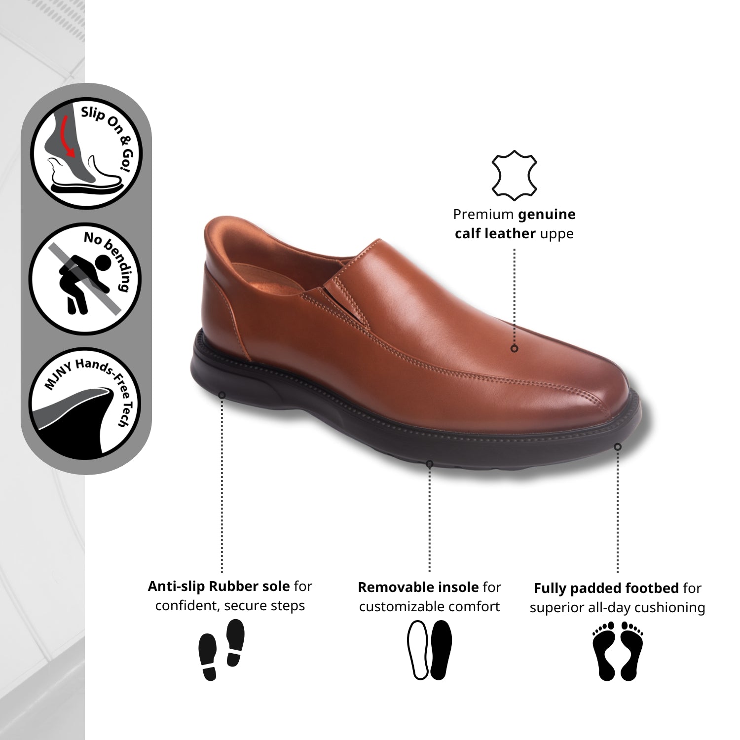 • Hands-Free tech (patent pending): slip-on, no bending, no heel-crush