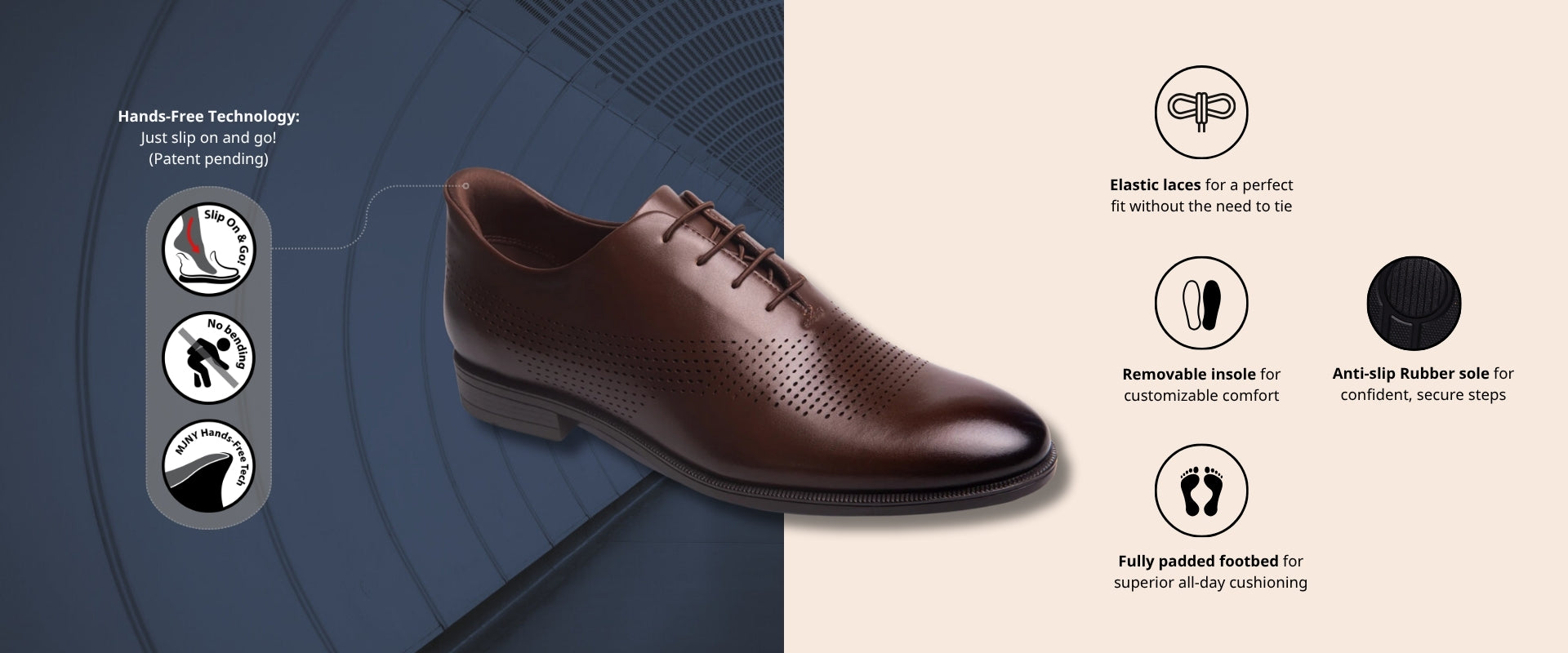 • Hands-Free tech (patent pending): slip-on, no bending, no heel-crush