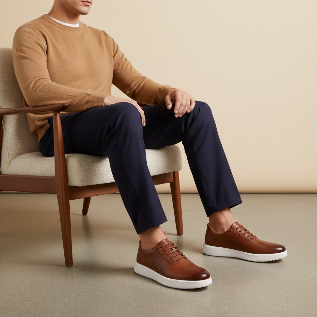 The 'Harbor Rd' is where minimalist design meets purposeful innovation. Built for fluid, everyday motion, it features Hands-Free (Patent pending) entry for seamless wear, a lightweight sole engineered to reduce fatigue, and elastic laces that adapt to your stride without ever needing to be tied. Wrapped and lined in supple genuine calf leather, it balances form and function with quiet confidence. Whether you're dressing up or paring down, this is the sneaker that effortlessly keeps pace—discreetly smart, undeniably refined.