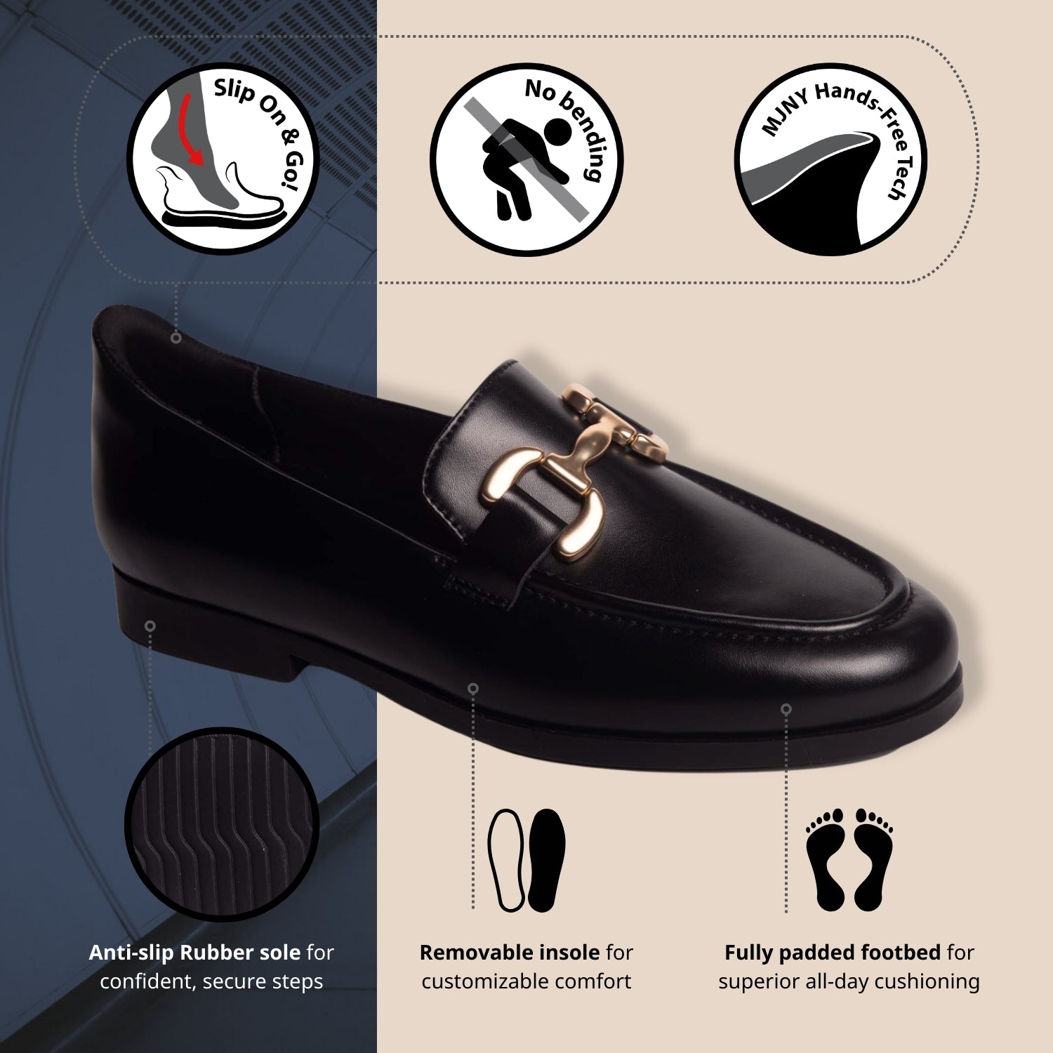 The 'Avery St' redefines everyday elegance with a modern twist. Crafted from genuine calf leather and elevated by a sleek horsebit accent, this loafer delivers sophistication without sacrificing ease. Designed with revolutionary hands-free technology (patent pending), it lets you glide in and out effortlessly—no bending, no fuss. Whether powering through meetings or stepping out for the evening, the 'Avery St' blends polished refinement with unparalleled convenience. For the discerning woman who demands both style and innovation, this is footwear that moves with you—flawlessly.