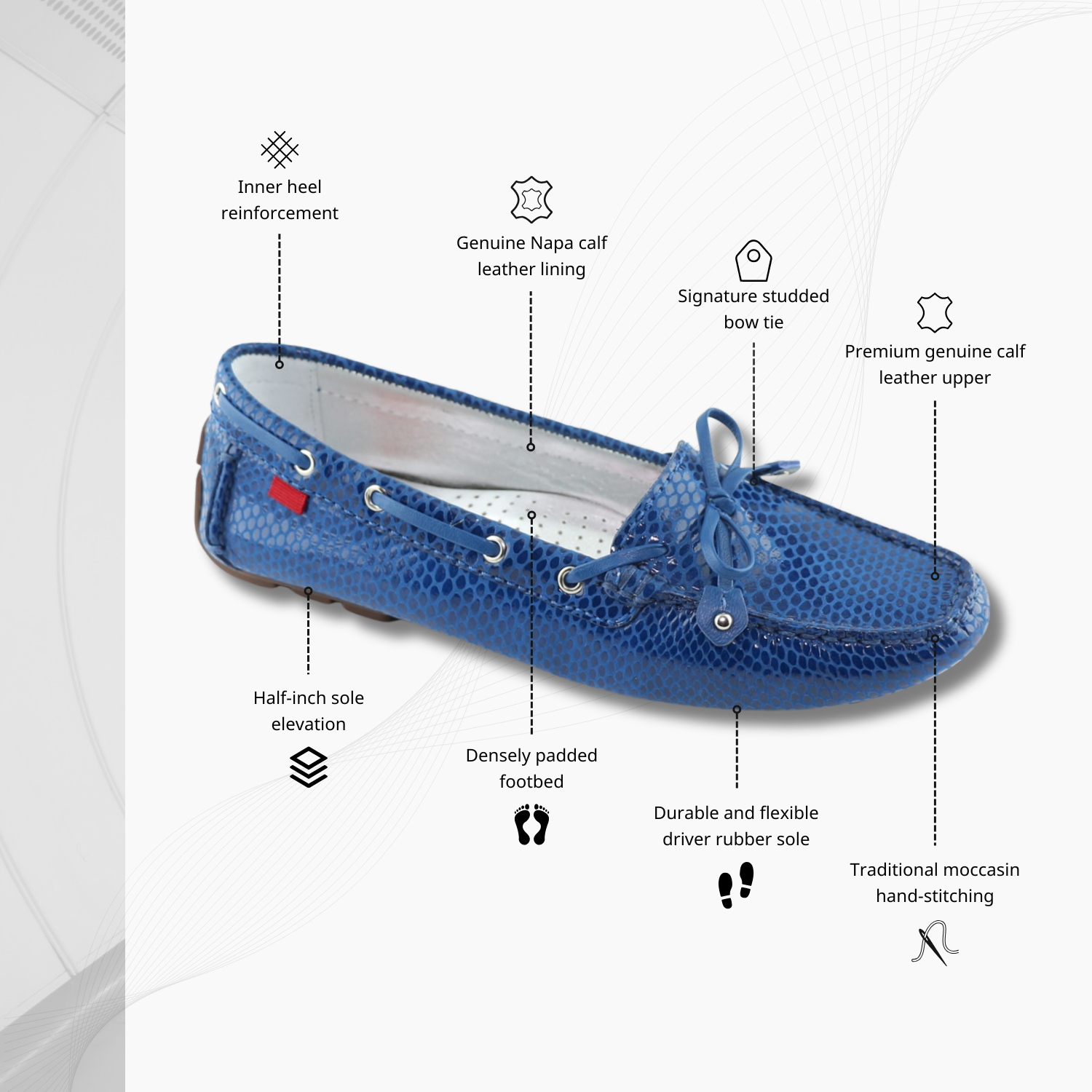 Designed in NYC and handcrafted in Brazil from genuine calf napa leather, inside and out. Traditional moccasin hand-stitching shapes a soft, glove-like fit. A gel heel insert and fully padded footbed absorb impact. The durable, flexible rubber driver sole with a ½-inch lift delivers quiet traction. Finished with a signature studded bow-tie, discreet tag, and emblazoned driver plug.