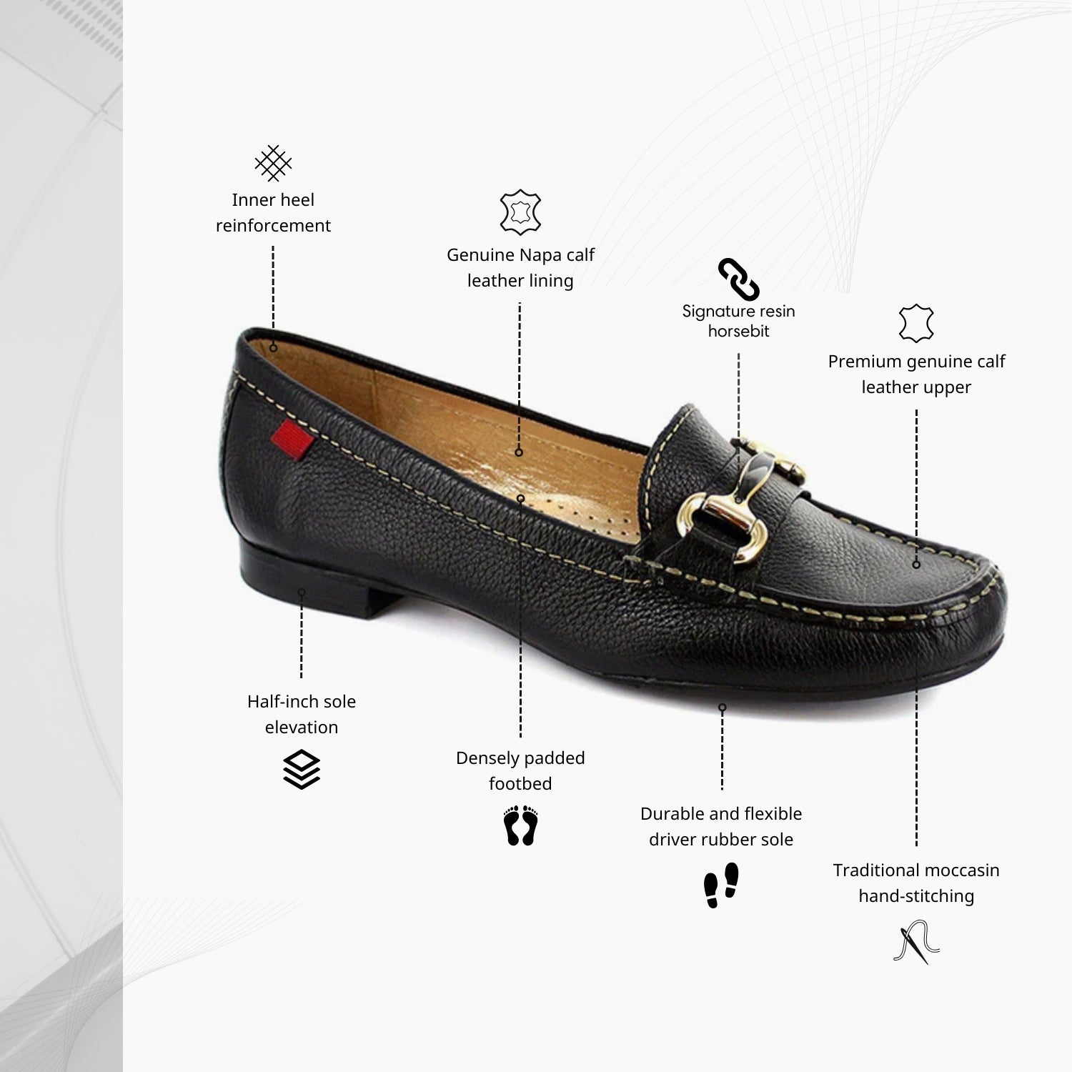 Experience luxurious comfort with Marc Joseph. Immerse yourself in our world of unrivaled craftsmanship, where each product is meticulously created with unwavering attention to detail. Enjoy the flexibility of our rubber sole, the timeless artistry of hand stitching, the luxurious softness and durability of genuine calf leather, and the ultimate comfort of our cushioned footbed.