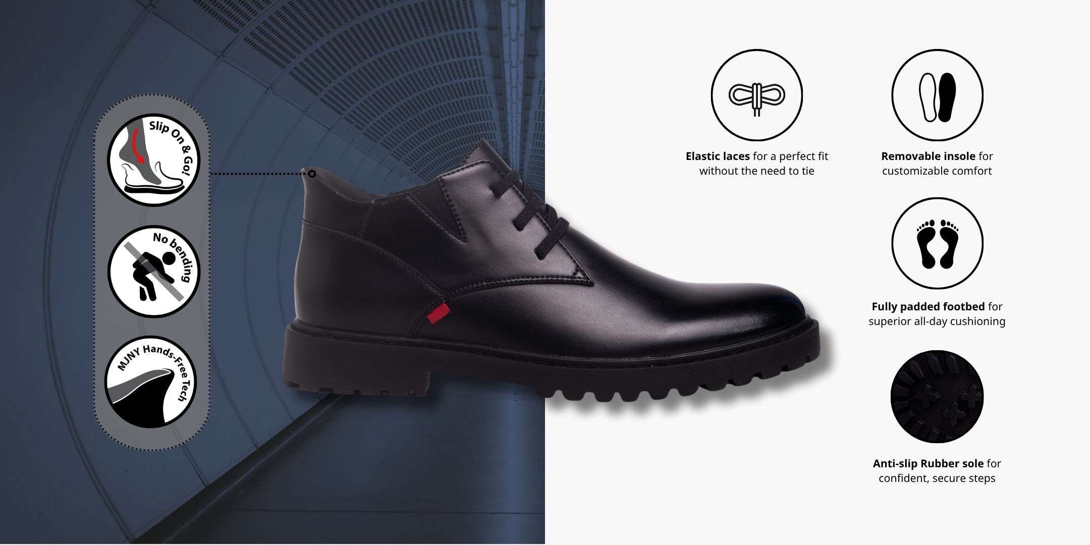 The 'Clark Rd' is where timeless sophistication meets modern innovation. Designed with the first-ever hands-free boot technology, it redefines everyday ease. Just slip on and go, no bending or tying required. Elastic laces offer a refined fit without compromising elegance, while the premium genuine calf leather upper and lining ensure lasting luxury inside and out. Underfoot, a fully padded footbed and removable insole provide cloud-like comfort, and an anti-slip rubber sole keeps every step secure. Crafted for the discerning gentleman who values style without sacrificing convenience.