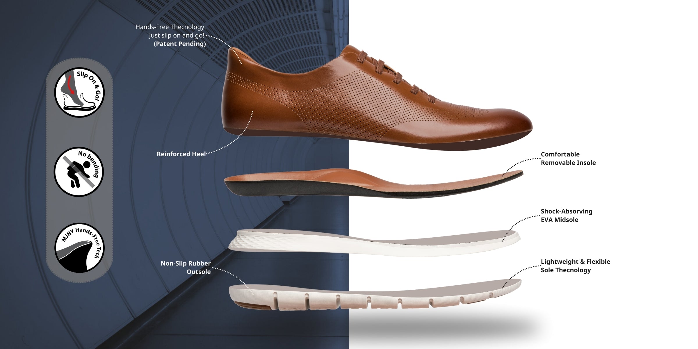 • Hands-Free Technology (Pending Patent): Slip on convenience—no bending, pulling, or crushed heels